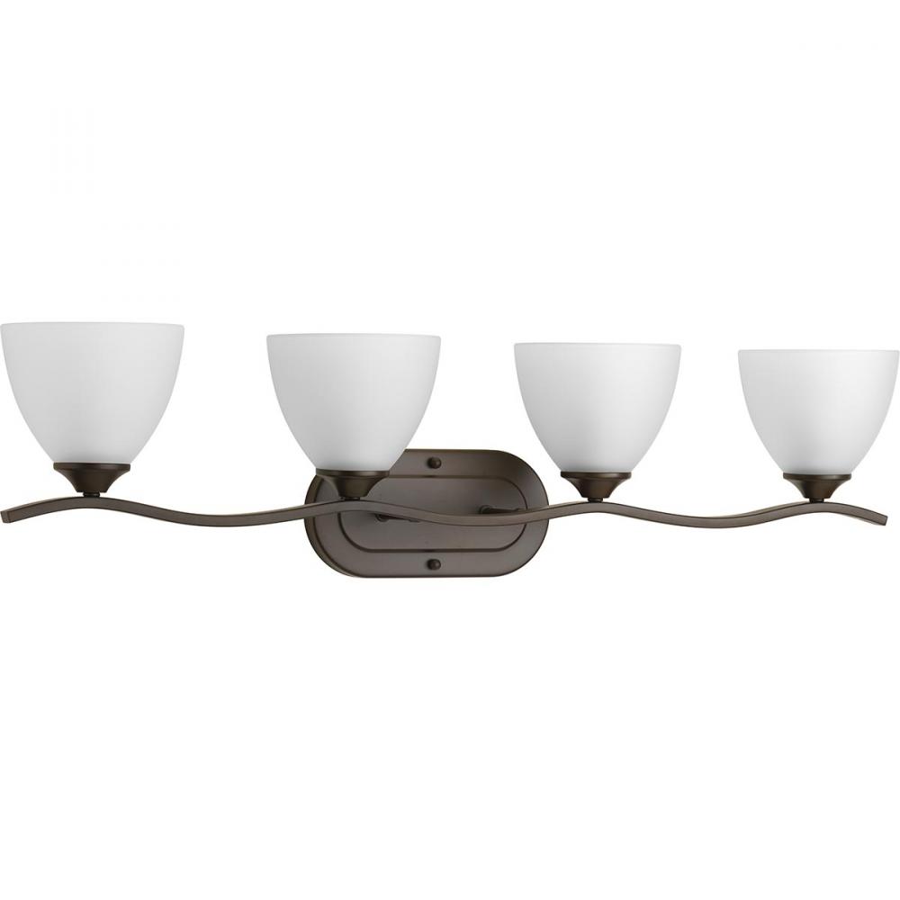 Ideal for a bathroom;Perfect for traditional and transitional style settings;Handsome antique bronze finish;Elegant etched glass shades;Mount the light fixture facing up or down;Use 4 medium base bulbs that are sold separately (100 W max - LED/CFL/incandes