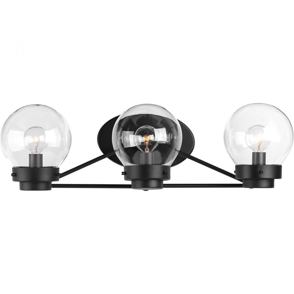 Ideal for a bathroom;Perfect for global, modern, modern mountain, and urban industrial style settings;Classic matte black finish;Crisp clear glass shades;Mount the light fixture facing up or down;Use 3 candelabra base bulbs that are sold separately (60 W m