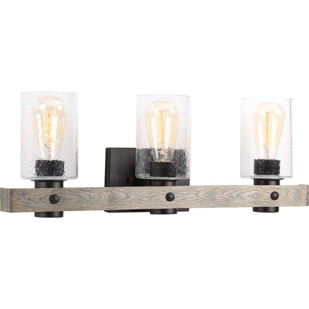 Ideal for a bathroom;Perfect for coastal, farmhouse, rustic, and urban industrial style settings;Gorgeous graphite finish with faux painted weathered driftwood accents;Rustic clear seeded glass shades;Mount the light fixture facing up or down;Use 3 medium