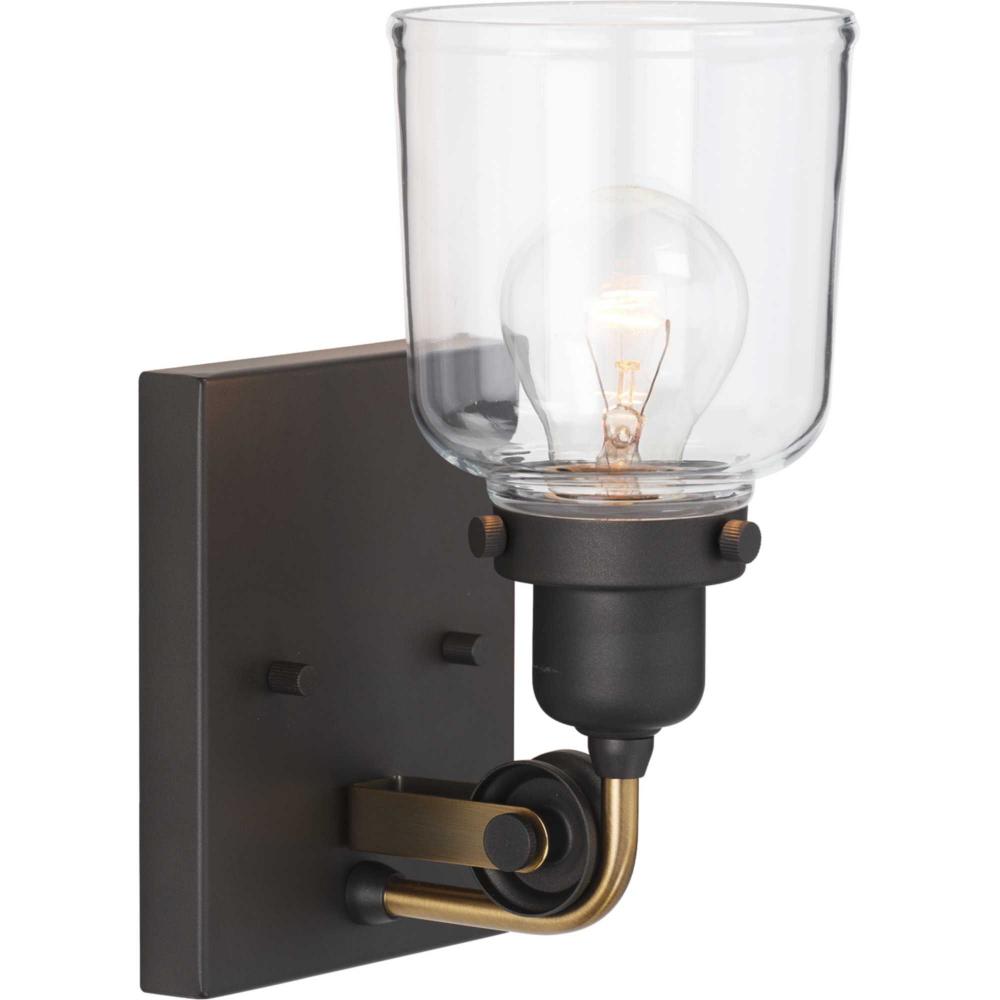 The Rushton one-light bath implies a sense of age and history with a mixed metal finish of Graphite accented by an Antique Brass tube arm. The refined backplate supports the charming pulley wheel that holds the antique-style socket. A clear glass shade circles an exposed bulb for an extra pinch of vintage taste that is just right for a bath mirror or wall sconce in industrial and farmhouse interiors.