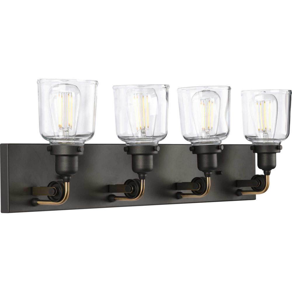 The Rushton four-light bath winks at its antique roots with steampunk-inspired pulley wheels supporting Antique Brass tube arms that join the light sources to the Graphite-finished backplate. Four sibling exposed glass bulbs hang in linear fashion, each sheathed with a clear glass shade securely held by antique-style sockets. A stunning, quintessential piece perfect as a bath vanity or wall sconce in industrial and farmhouse settings.