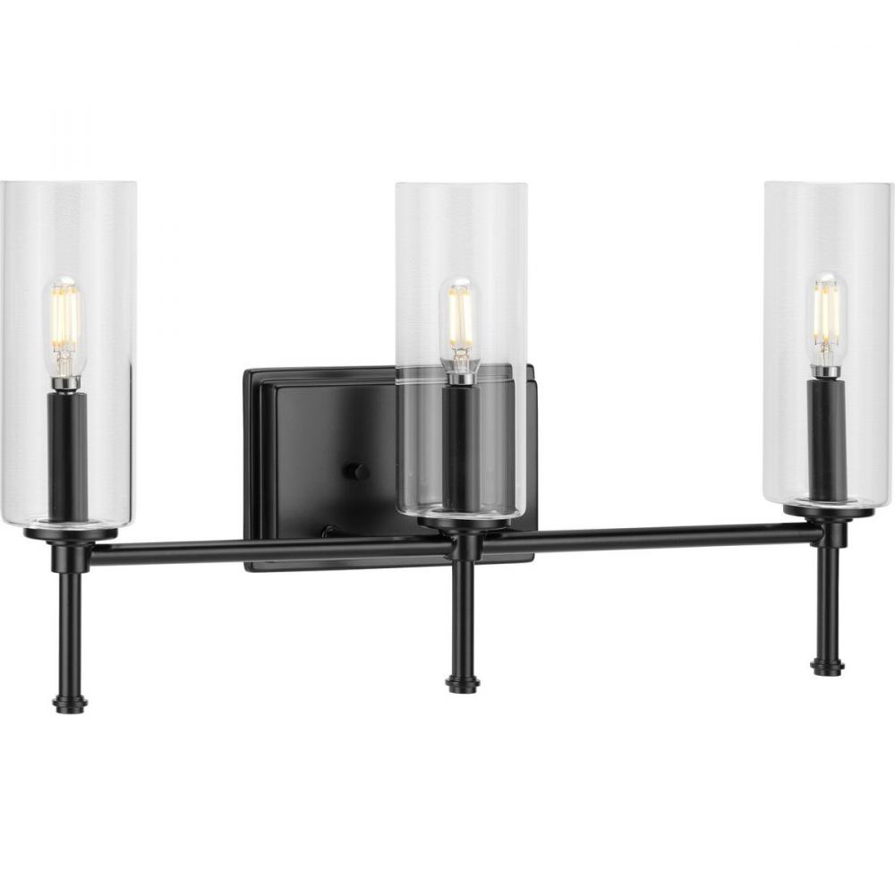 Ideal for a bathroom;Perfect for new traditional style settings;Beautiful matte black finish;Crisp clear cylindrical glass shades;Use 3 candelabra base bulbs that are sold separately (60w max - LED/CFL/incandescent), compatible with dimmable bulbs;Measures