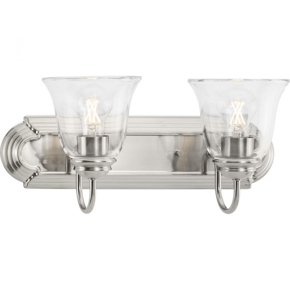 The clear glass vanity light features an extended backplate and crisp glass shades that casts the ideal light in the bathroom;Updated styling perfect for transitional settings in today's home;A beautiful brushed nickel finish lends an aura of refinemen