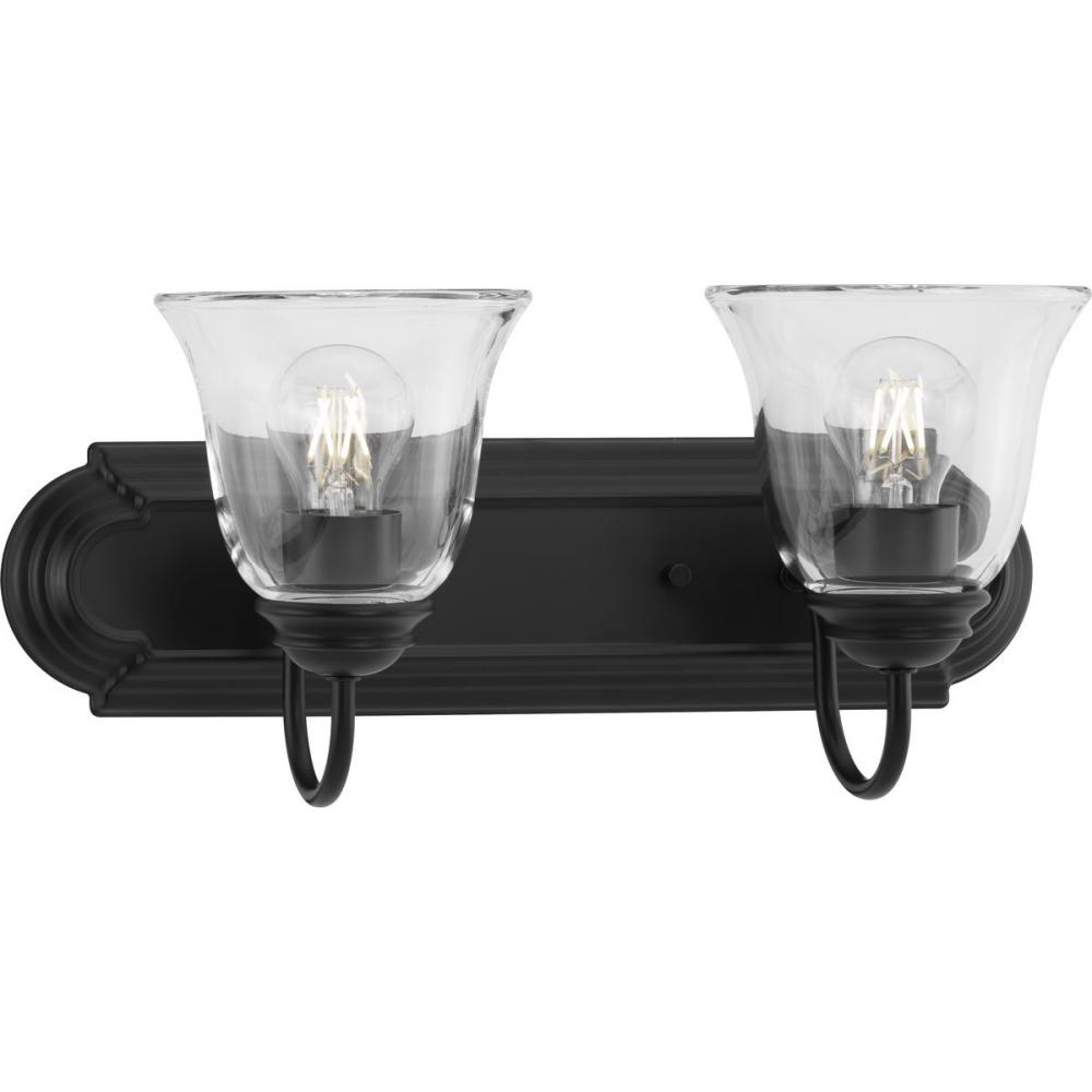 The clear glass vanity light features an extended backplate and crisp glass shades that casts the ideal light in the bathroom;Updated styling perfect for transitional settings in today's home;A classic matte black finish lends an aura of refinement;Cri