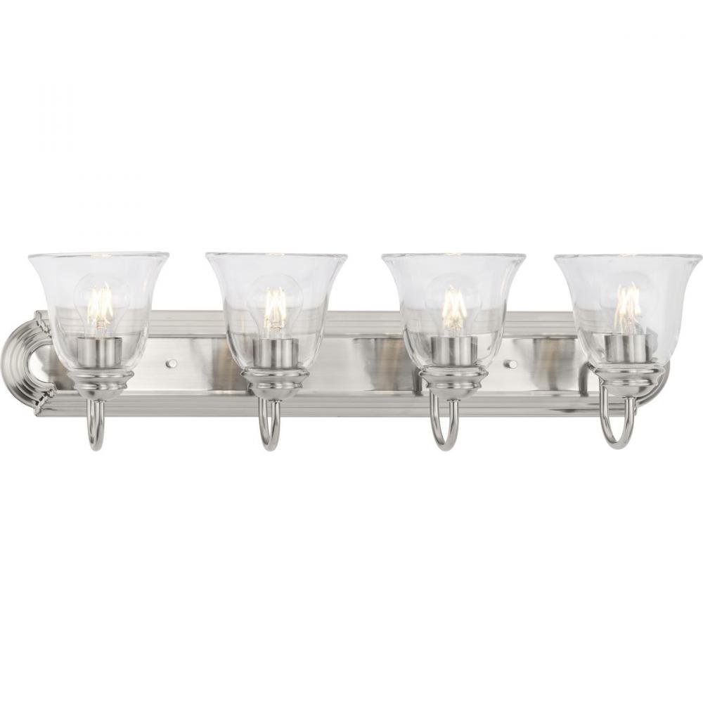 For transitional bathroom or vanity settings that seeks illumination, look no further than this clear glass vanity light. It features an updated transitional design finished in brushed nickel complemented by clear glass flared shades that offer classic appeal. An extended backplate with scalloped edges provides generous coverage for easy installation. This versatile fixture can be mounted up or down to provide the perfect amount of even illumination.