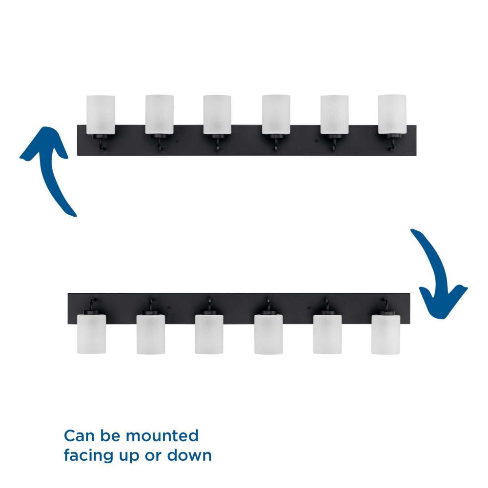 Incorporate a clean, contemporary design with the Merry Collection 6-Light Etched Glass Matte Black Transitional Bath Vanity Light. Light sources glow from within crisp etched glass shades for a generous elegant glow sure to transform any bath into a modern retreat. The rectangular backplate, curved arms, and round light bases are coated in a beautiful matte black finish that perfectly blends transitional and modern character. For ideal illumination, use 6 medium base bulbs that are sold separately (100w max - LED/CFL/incandescent). The bath light is compatible with dimmable bulbs. The bath vanity light's contemporary design is ideal for any bathroom in modern and transitional style settings. It's time to breathe new life into the mundane every day with timeless and truly transformative lighting. Make your purchase today to begin your journey to a whole new lighting experience. Progress Lighting products are designed for exceptional quality, reliability, and functionality.