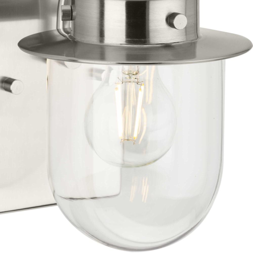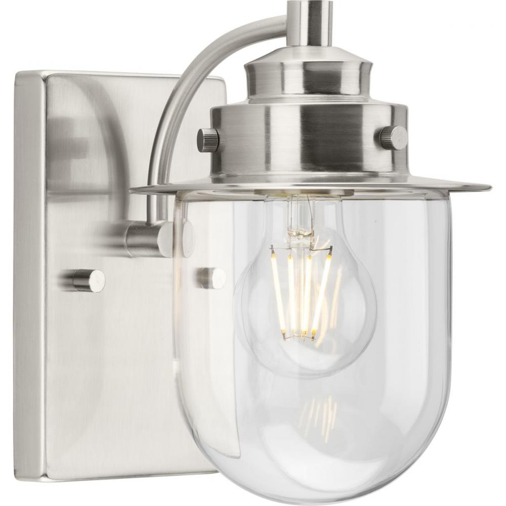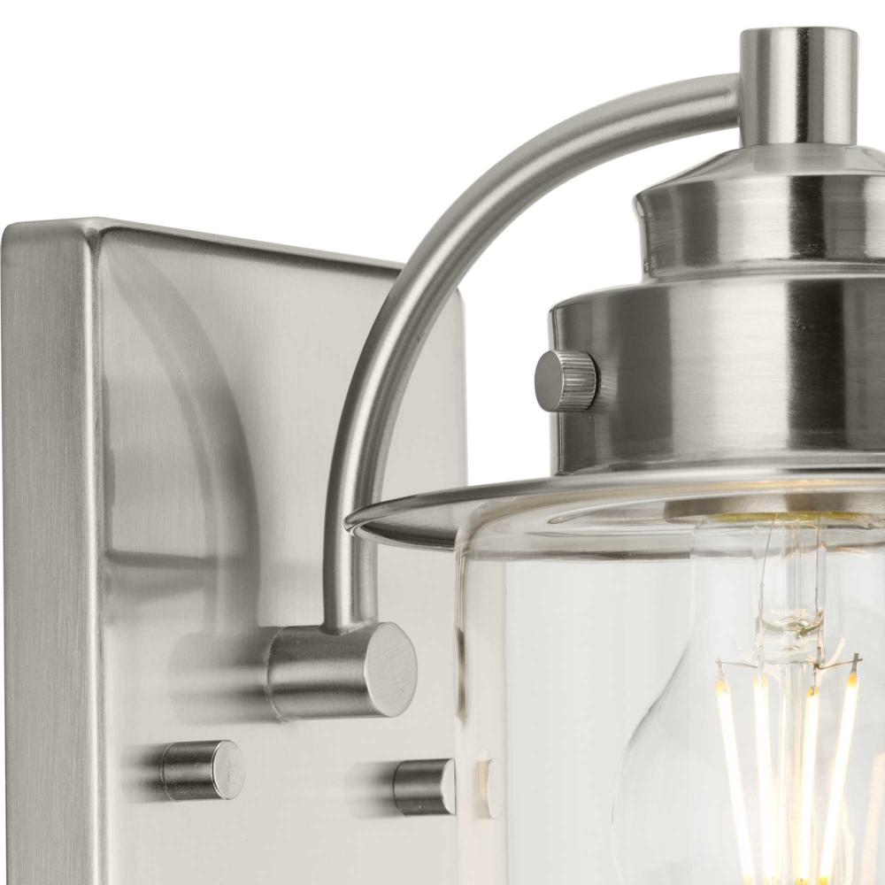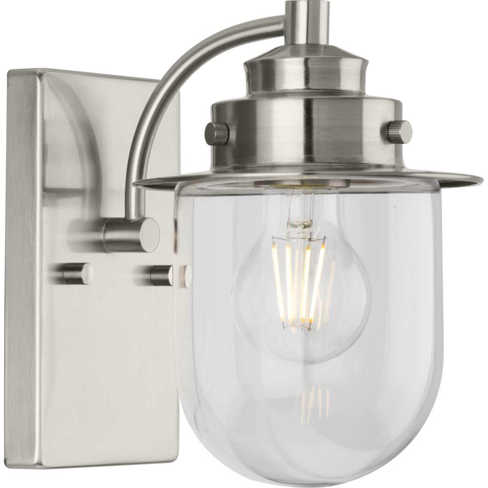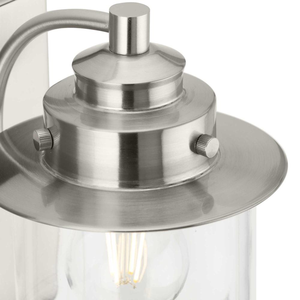 The nostalgic Northlake Collection combines classic design influences with nautical inspiration. Finished in brushed nickel, the rounded diffuser and layered caps are reminiscent of floating buoys and weekends on a mountain lake. A clear glass shade casts a pleasing glow in bathrooms, powder rooms, hallways and living rooms in coastal and transitional settings. This versatile fixture can be mounted up or down, increasing its design flexibility. It is cULus damp rated and has a one-year warranty to guarantee your complete satisfaction. Progress Lighting products offer exceptional quality, reliability, and functionality. .
