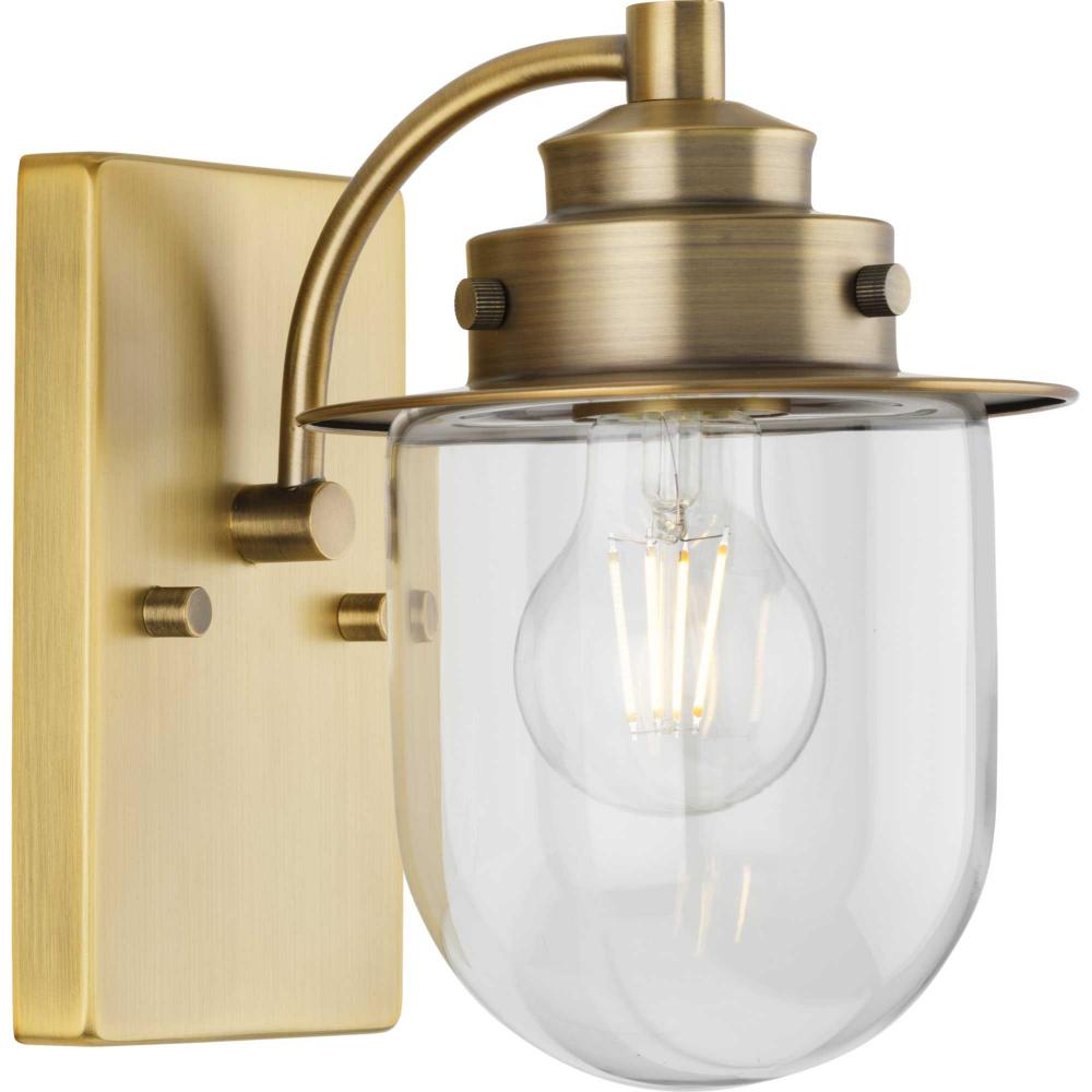 The nostalgic Northlake Collection combines classic design influences with nautical inspiration. Finished in vintage brass, the rounded diffuser and layered caps are reminiscent of floating buoys and weekends on a mountain lake. A clear glass shade casts a pleasing glow in bathrooms, powder rooms, hallways and living rooms in coastal and transitional settings. This versatile fixture can be mounted up or down, increasing its design flexibility. It is cULus damp rated and has a one-year warranty to guarantee your complete satisfaction. Progress Lighting products offer exceptional quality, reliability, and functionality. .