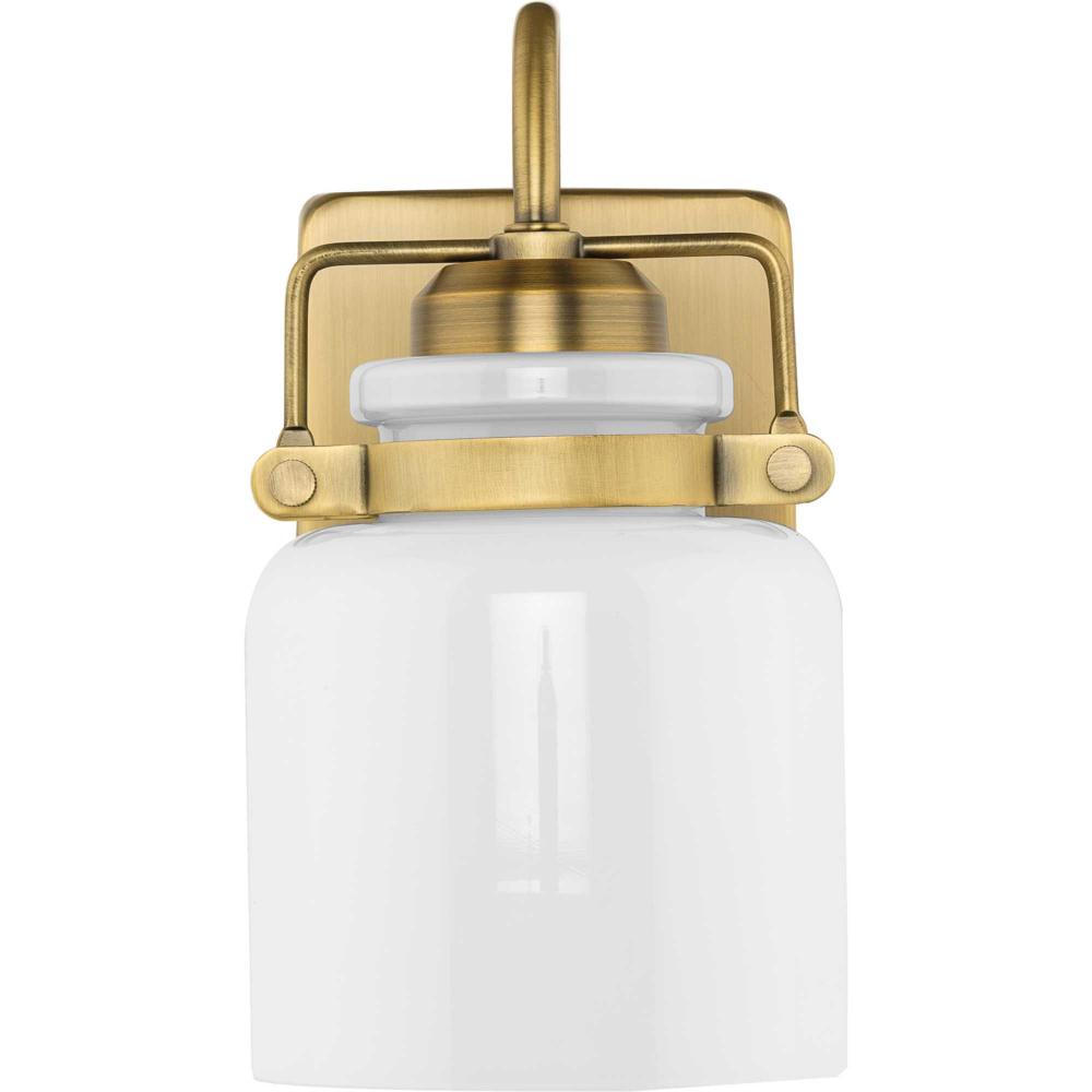 Distinctive mechanical details establish a nostalgic flair in the elegant Fessler collection. Opal glass shades deliver comfortable diffuse illumination to bathrooms, powder rooms, hallways and living rooms in transitional and farmhouse settings. The decorative frame is coated in a stately vintage brass and features authentically crafted hardware elements that complements the curved opal shades. This versatile fixture can be mounted up or down, increasing its design flexibility. It is cULus damp location listed, with a one-year warranty to guarantee your complete satisfaction. Progress Lighting products are designed for exceptional quality, reliability, and functionality. .