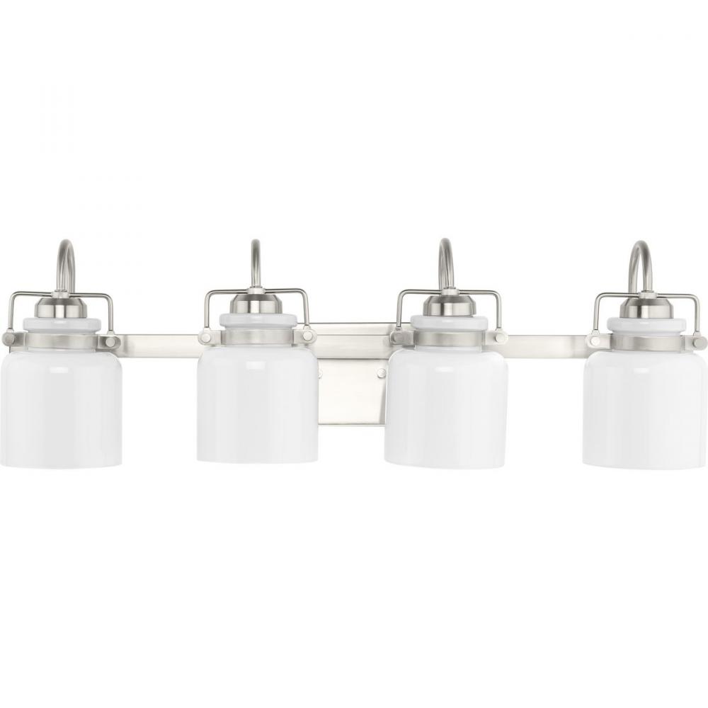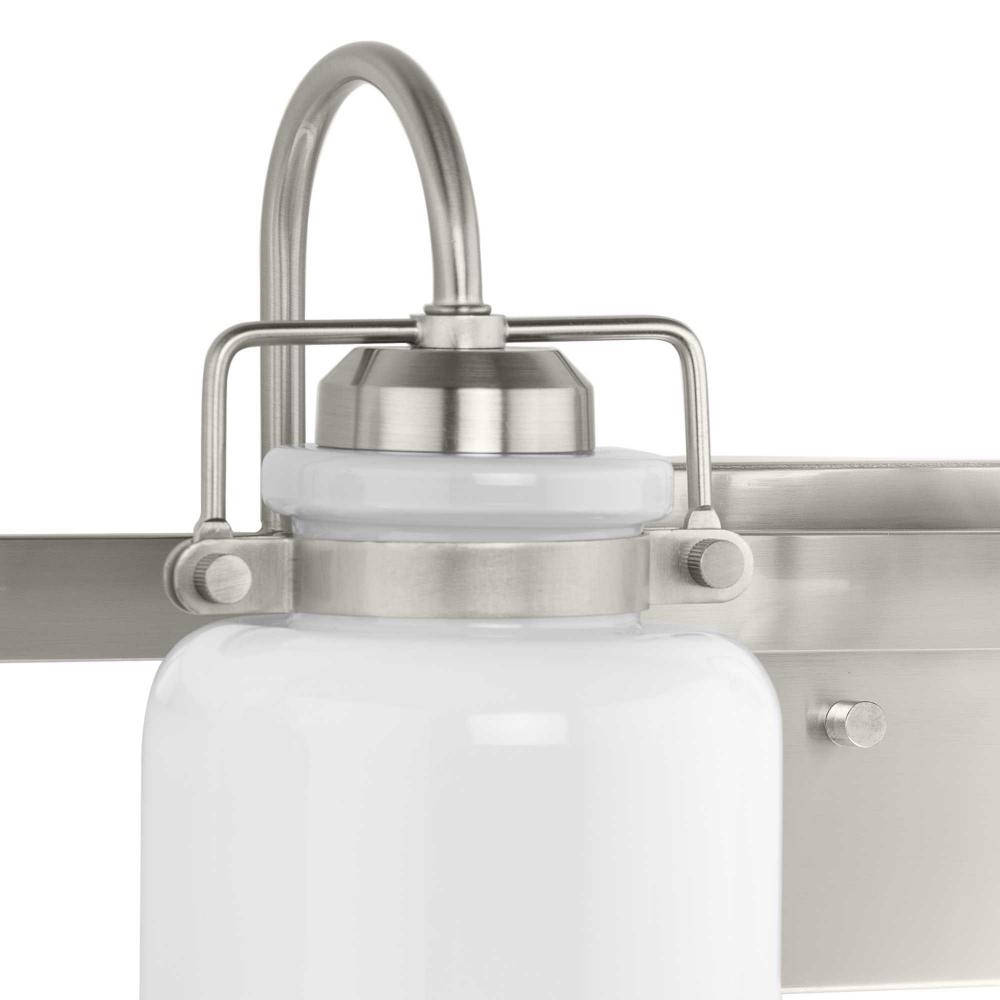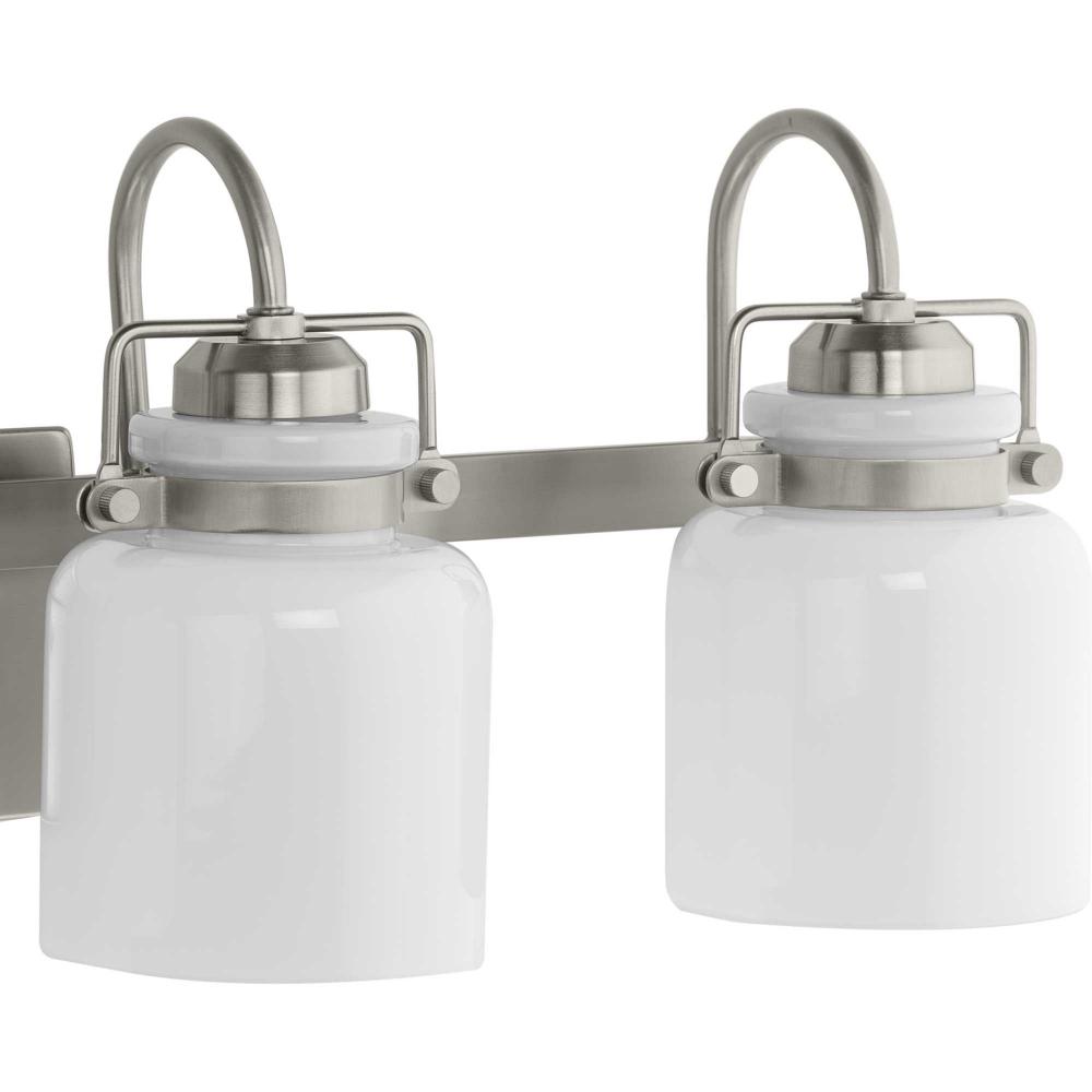 Distinctive mechanical details establish a nostalgic flair in the elegant Fessler collection. Opal glass shades deliver comfortable diffuse illumination to bathrooms and powder rooms in transitional and farmhouse settings. The decorative frame is coated in a subtle brushed nickel and features authentically crafted hardware elements that complements the curved opal shades. This versatile fixture can be mounted up or down, increasing its design flexibility. It is cULus damp location listed, with a one-year warranty to guarantee your complete satisfaction. Progress Lighting products are designed for exceptional quality, reliability, and functionality. .