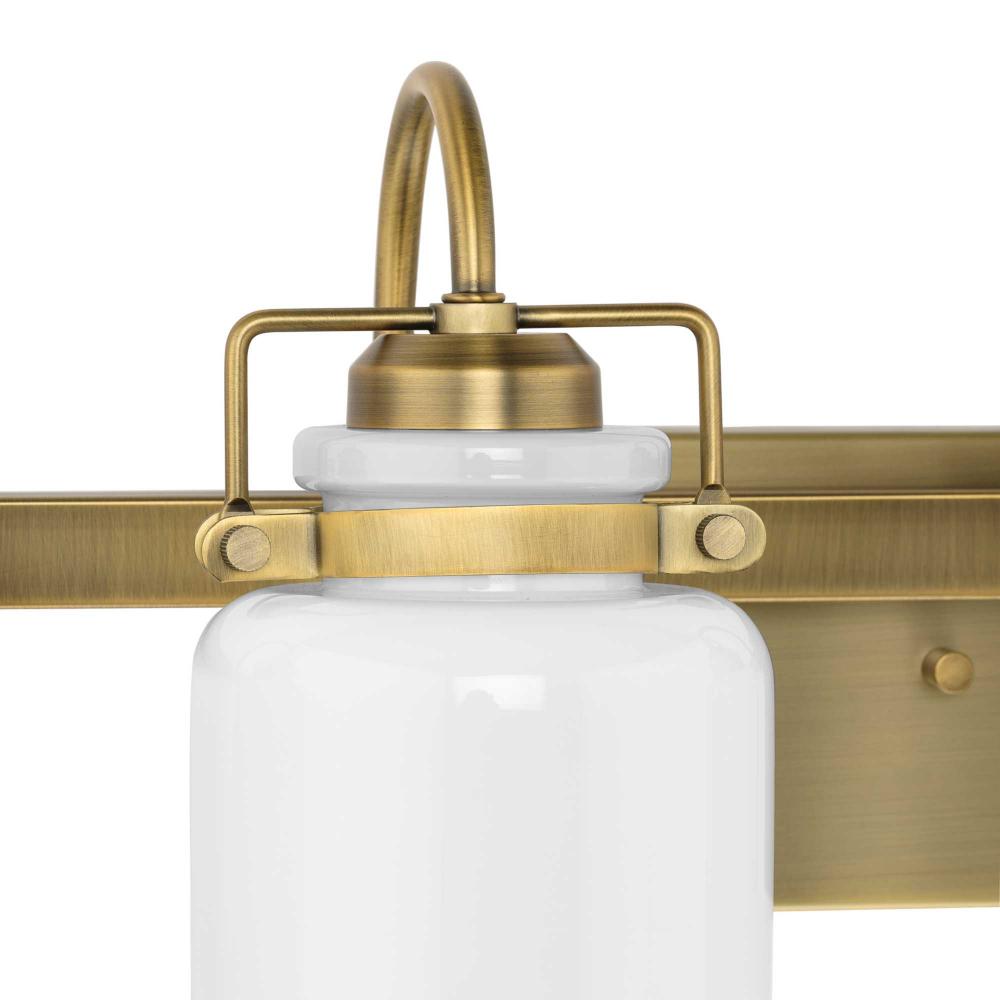 Distinctive mechanical details establish a nostalgic flair in the elegant Fessler collection. Opal glass shades deliver comfortable diffuse illumination to bathrooms and powder rooms in transitional and farmhouse settings. The decorative frame is coated in a stately vintage brass and features authentically crafted hardware elements that complements the curved opal shades. This versatile fixture can be mounted up or down, increasing its design flexibility. It is cULus damp location listed, with a one-year warranty to guarantee your complete satisfaction. Progress Lighting products are designed for exceptional quality, reliability, and functionality. .