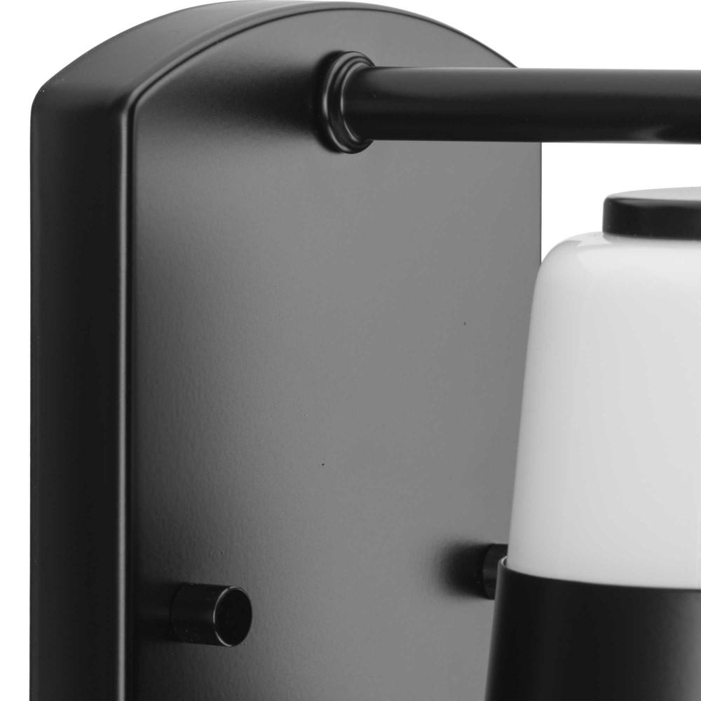 The Haven Collection is practical and stylish with a modern color blocking silhouette that fits perfectly in luxe industrial and contemporary rooms. The metal frame is finished in crisp matte black and features a shade suspended from an oblong backplate. Etched opal glass casts a pleasing, softened glow in bathrooms and powder rooms. This versatile fixture can be mounted up or down, increasing its design flexibility. It is cULus damp location listed, with a one-year warranty to guarantee your complete satisfaction. Progress Lighting products offer exceptional quality, reliability, and functionality. .