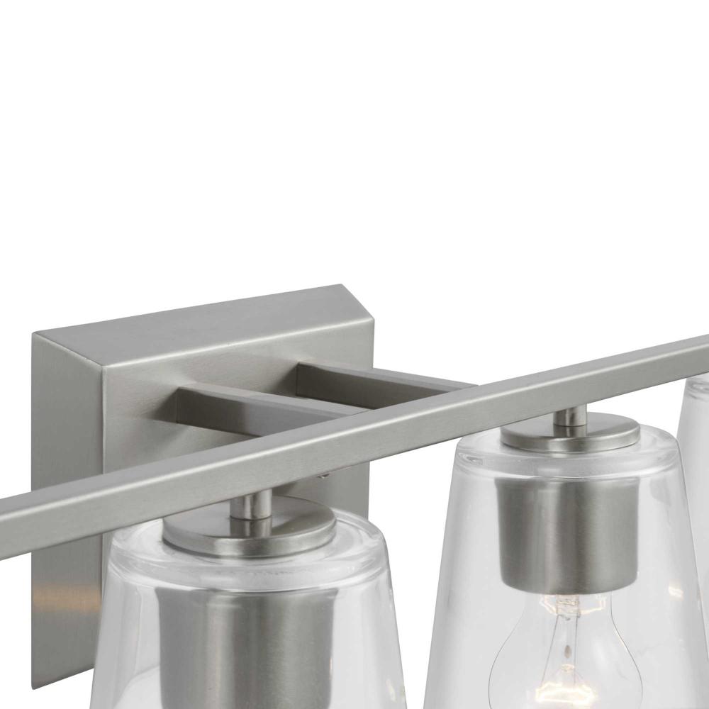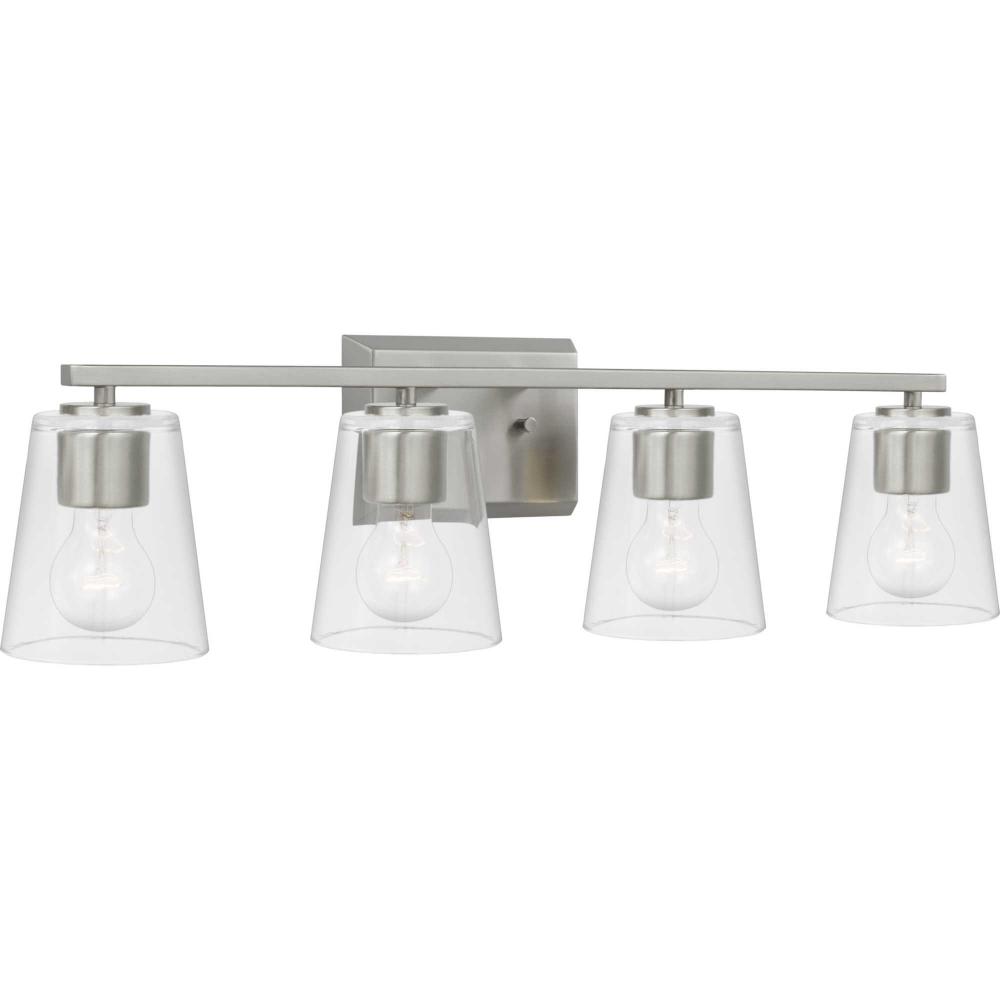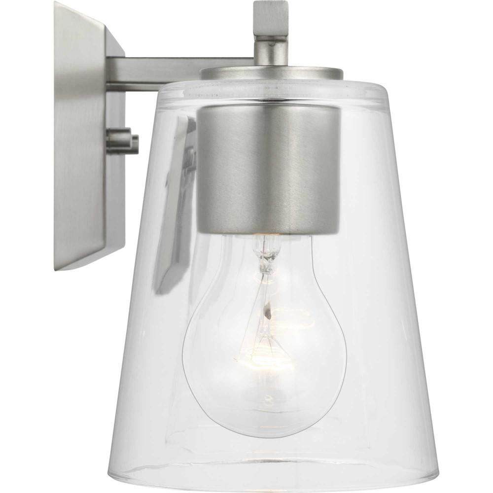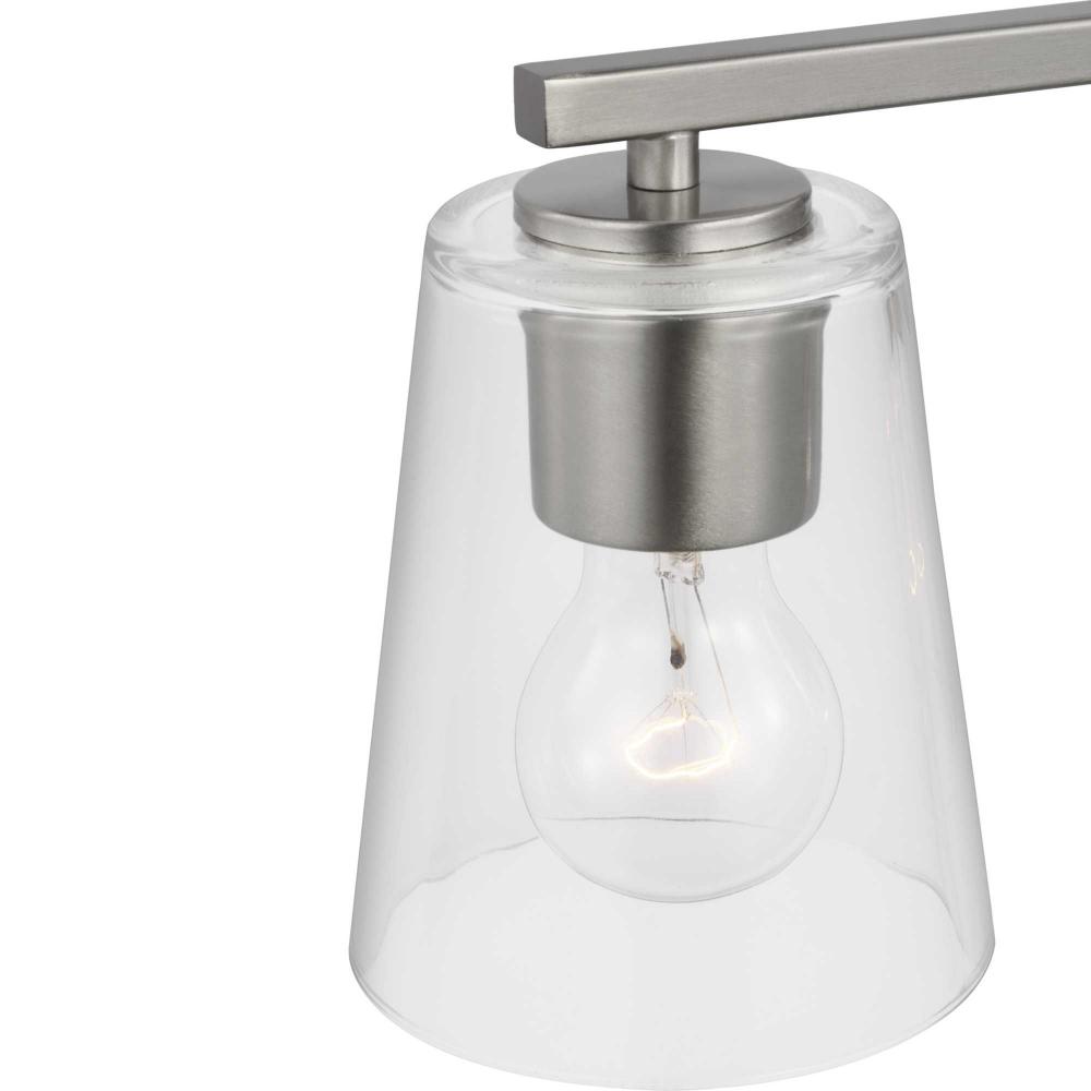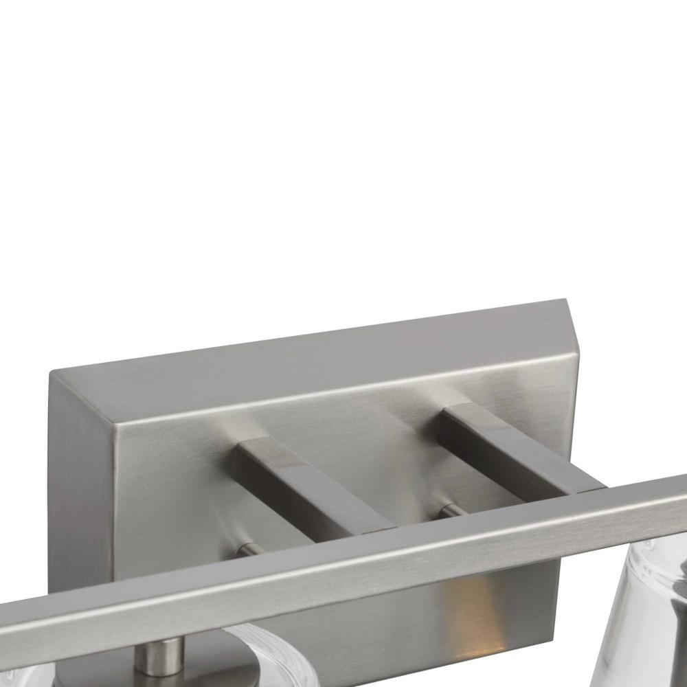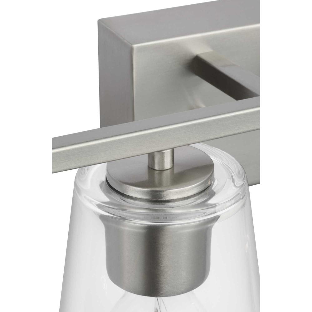 Elegantly extended, the Vertex Collection is composed of angular forms finished in subtle brushed nickel to create a bold design that perfectly complements modern interiors. Glass shades delivers bright illumination to bathrooms and powder rooms in contemporary settings. This versatile fixture can be mounted up or down, increasing its design flexibility. It is cULus damp rated and has a one-year warranty to guarantee your complete satisfaction. Progress Lighting products offer exceptional quality, reliability, and functionality. .