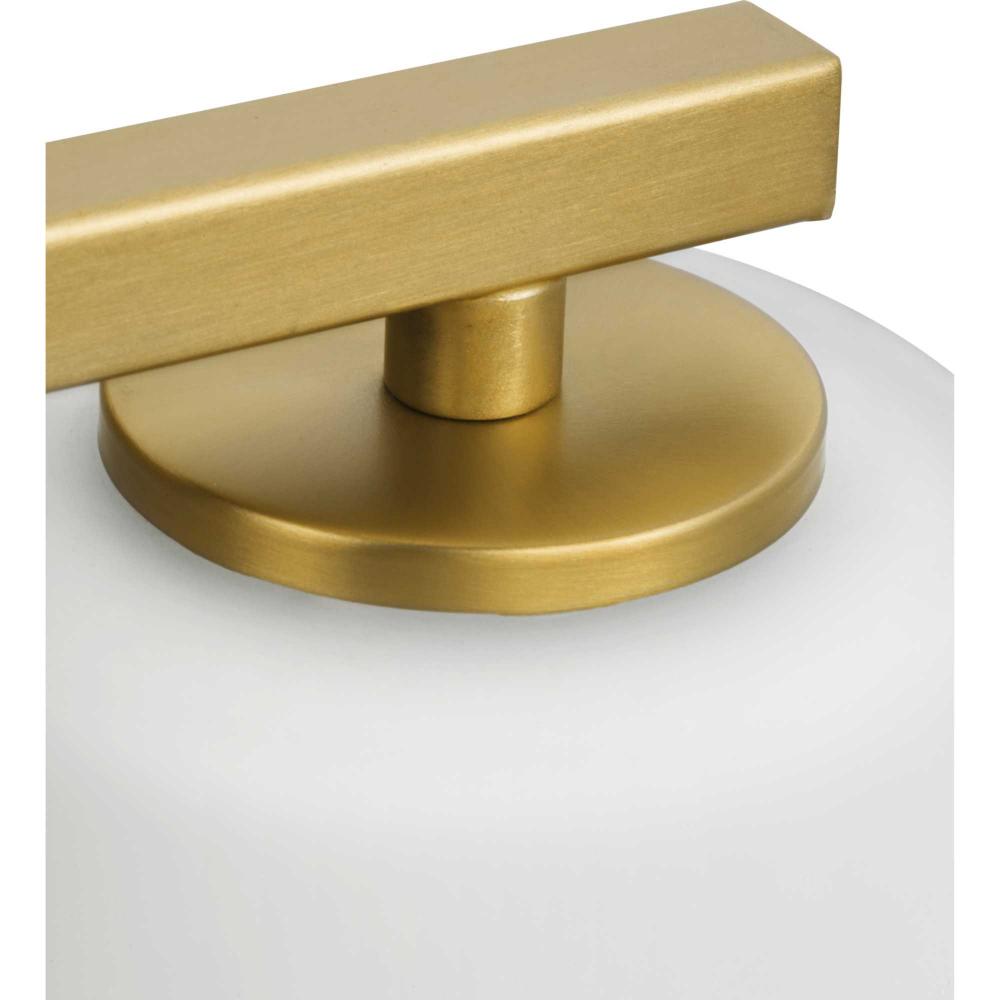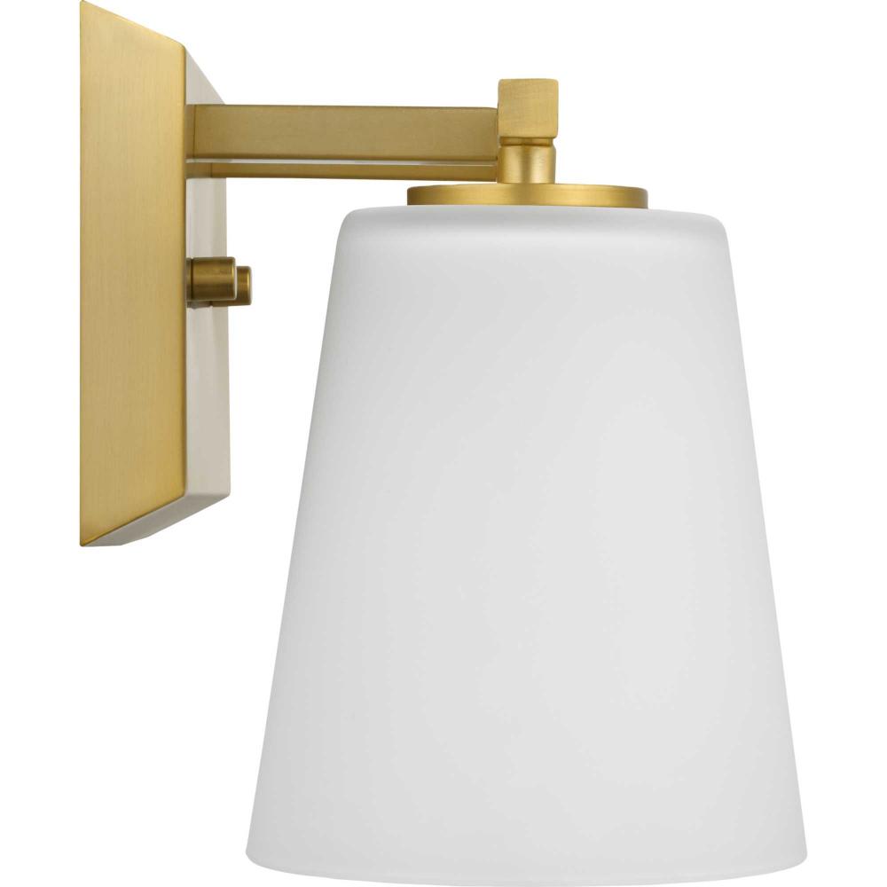 Elegantly extended, the Vertex Collection is composed of angular forms finished in soft brushed gold to create a bold design that perfectly complements modern interiors. Glass shades delivers bright illumination to bathrooms and powder rooms in contemporary settings. This versatile fixture can be mounted up or down, increasing its design flexibility. It is cULus damp rated and has a one-year warranty to guarantee your complete satisfaction. Progress Lighting products offer exceptional quality, reliability, and functionality. .