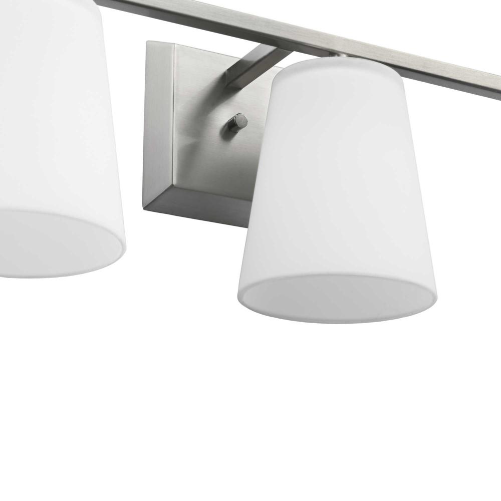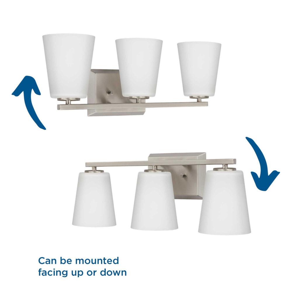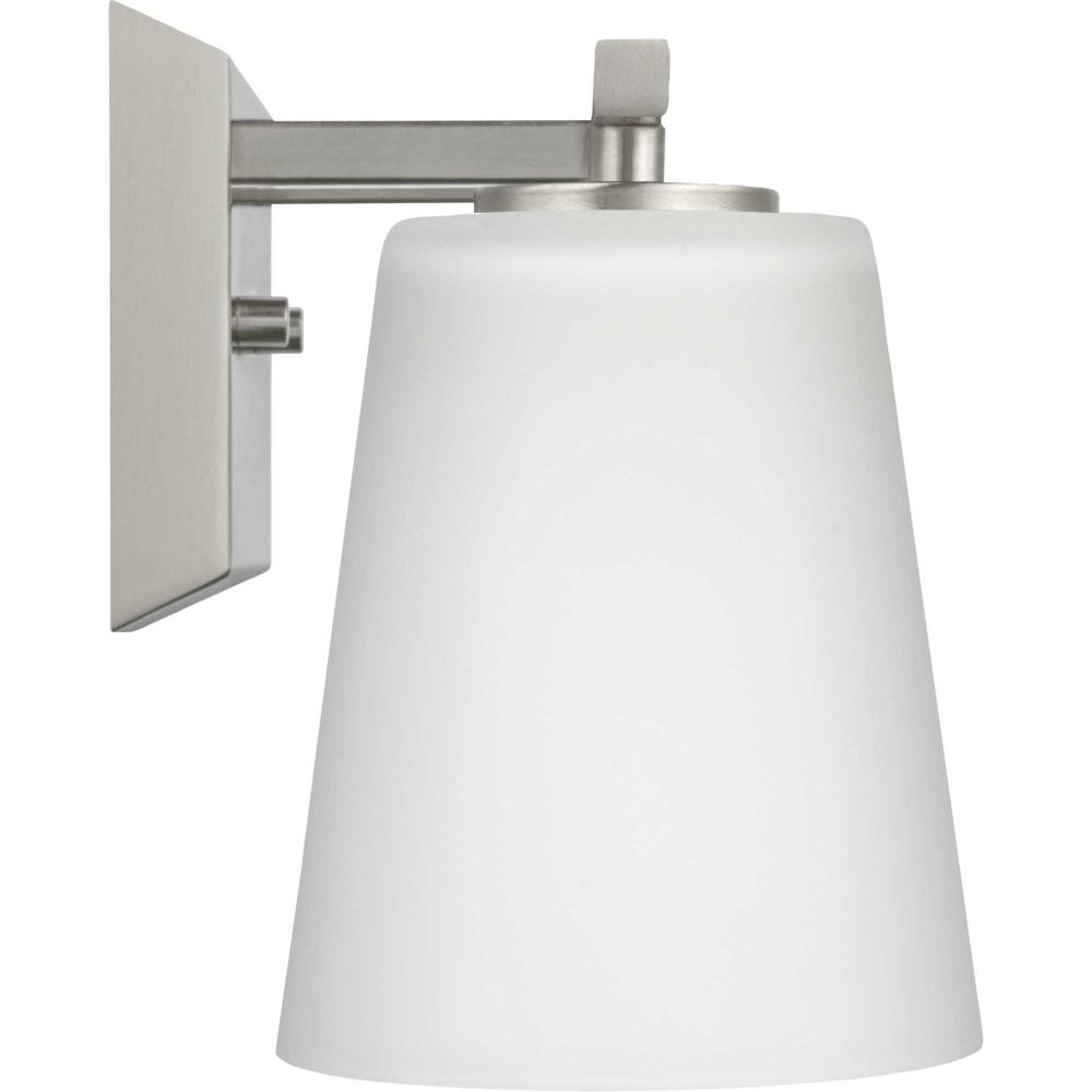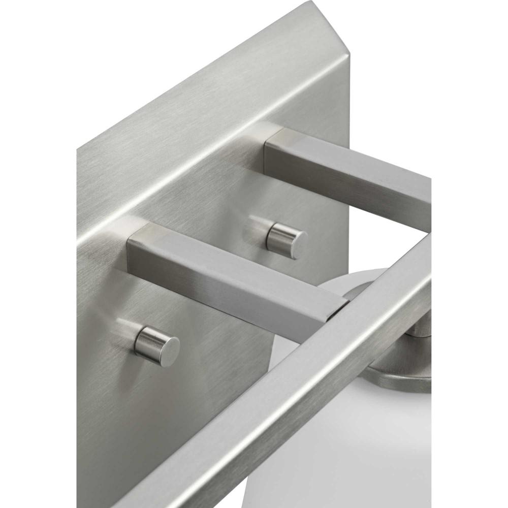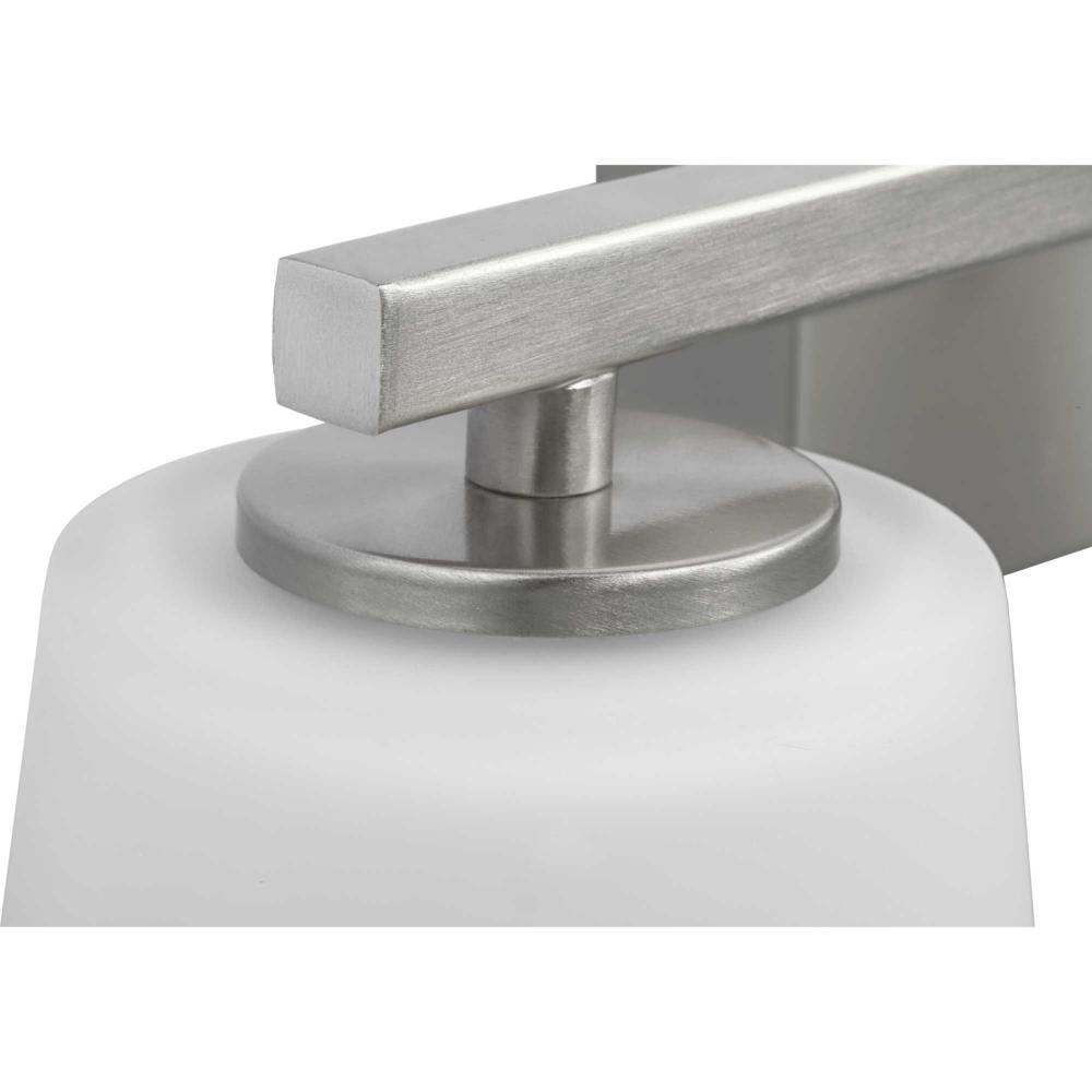 Elegantly extended, the Vertex Collection is composed of angular forms finished in subtle brushed nickel to create a bold design that perfectly complements modern interiors. Glass shades delivers bright illumination to bathrooms and powder rooms in contemporary settings. This versatile fixture can be mounted up or down, increasing its design flexibility. It is cULus damp rated and has a one-year warranty to guarantee your complete satisfaction. Progress Lighting products offer exceptional quality, reliability, and functionality. .
