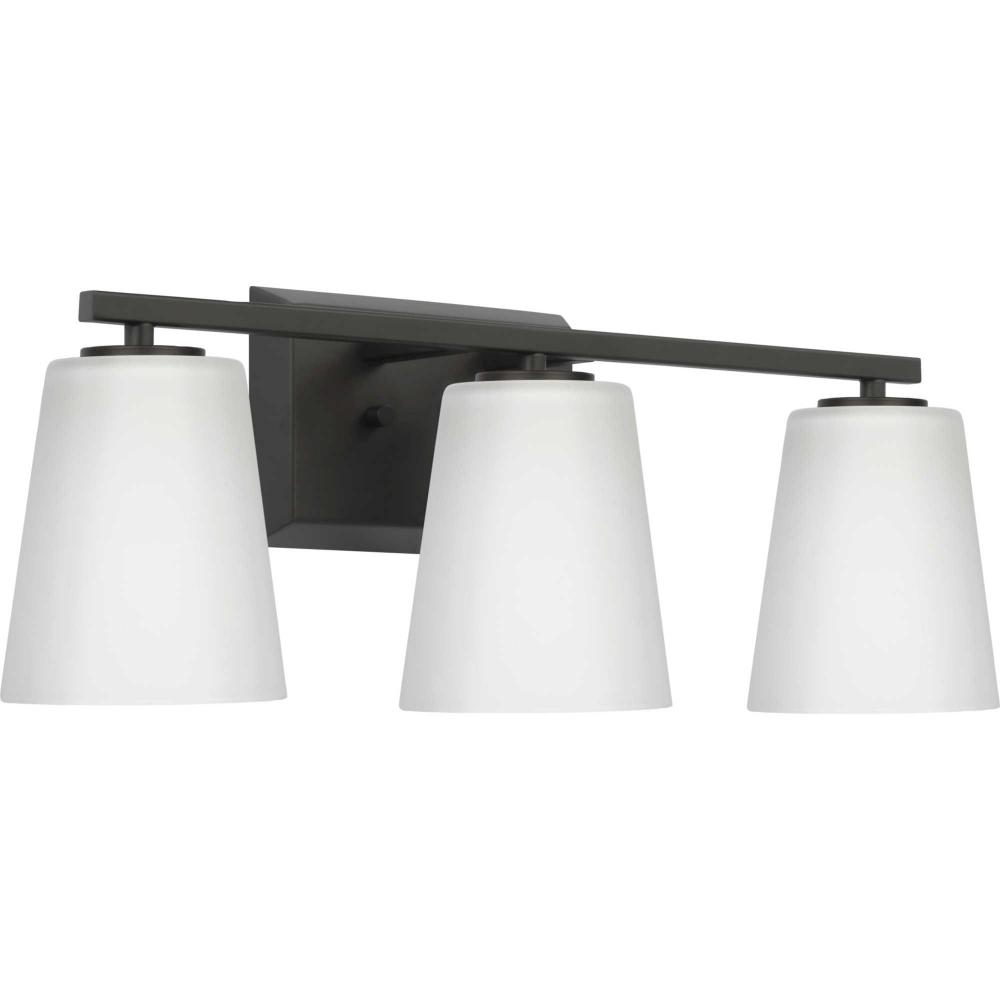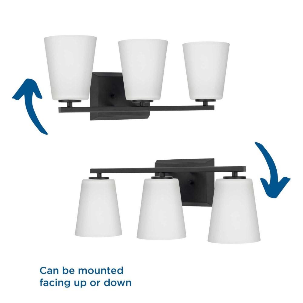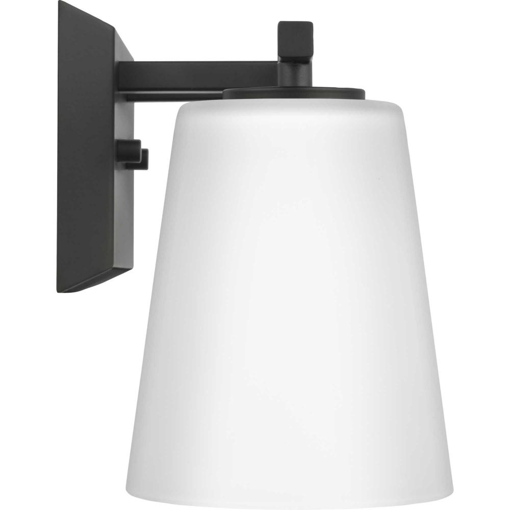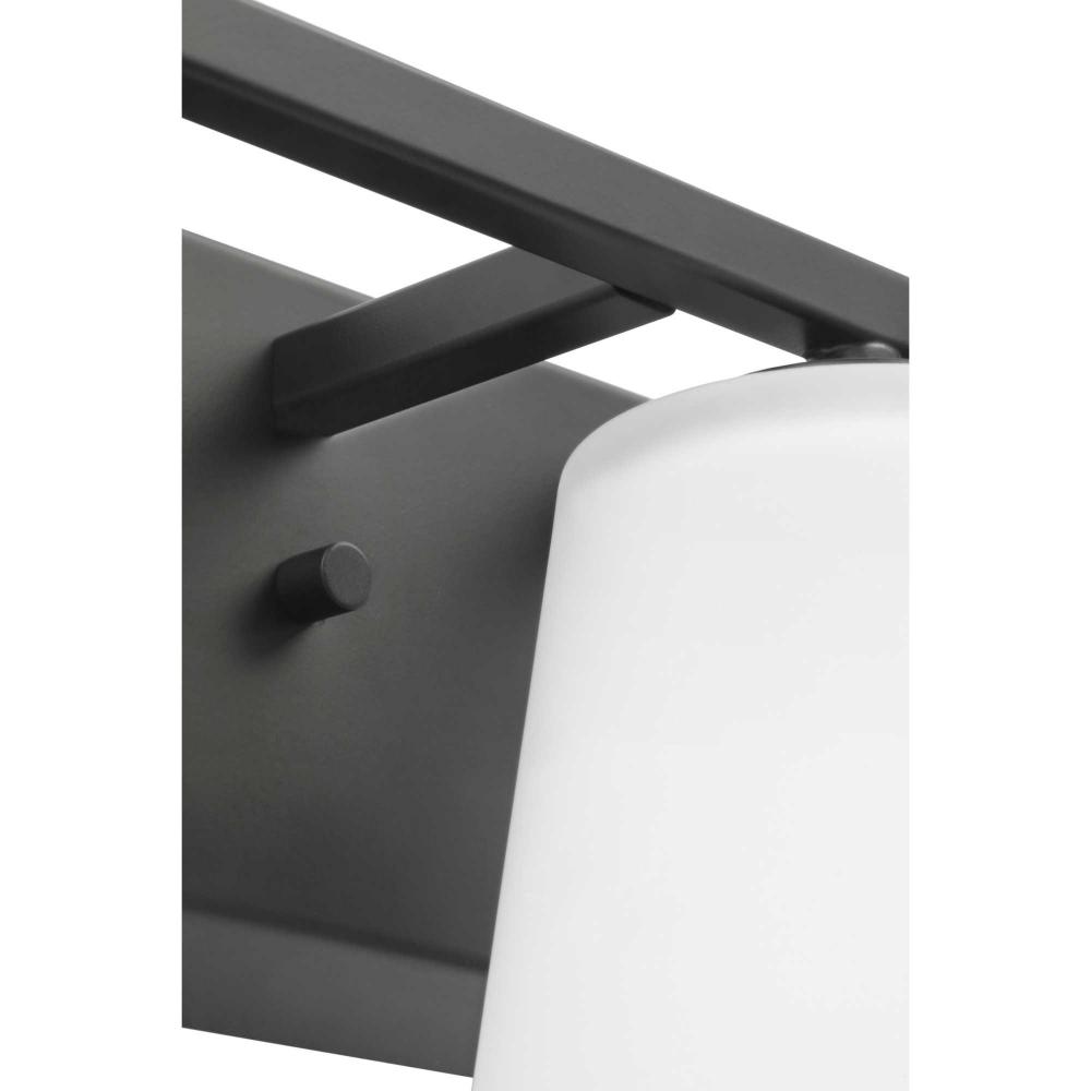 Elegantly extended, the Vertex Collection is composed of angular forms finished in crisp matte black to create a bold design that perfectly complements modern interiors. Glass shades delivers bright illumination to bathrooms and powder rooms in contemporary settings. This versatile fixture can be mounted up or down, increasing its design flexibility. It is cULus damp rated and has a one-year warranty to guarantee your complete satisfaction. Progress Lighting products offer exceptional quality, reliability, and functionality. .