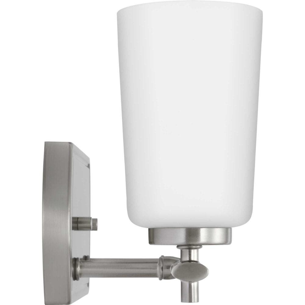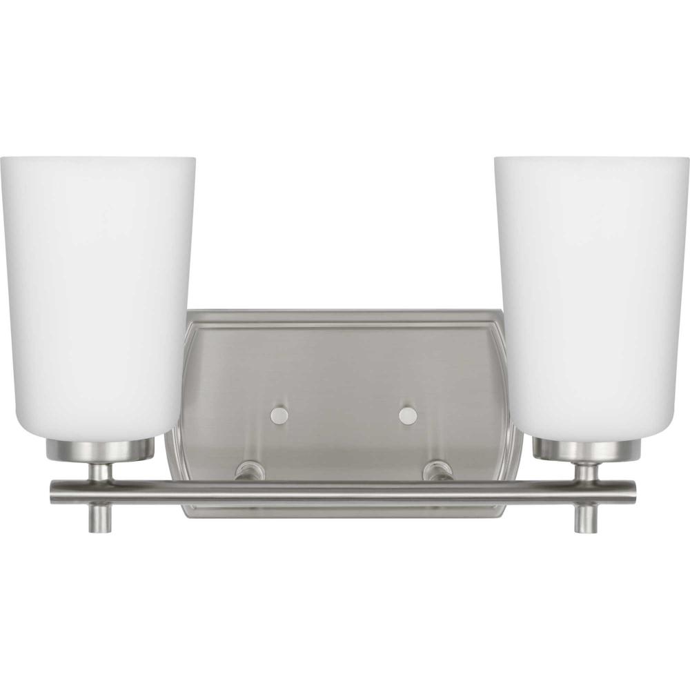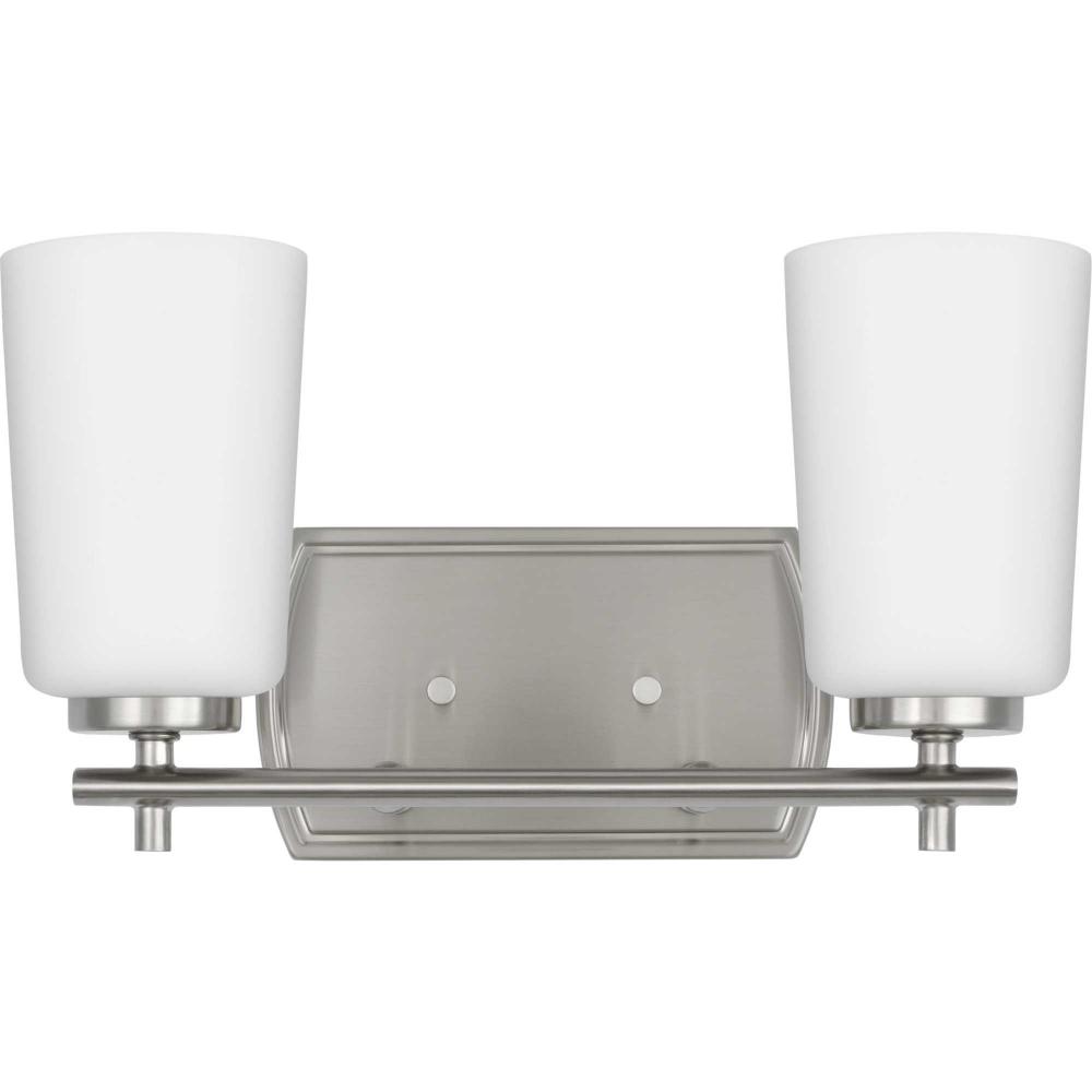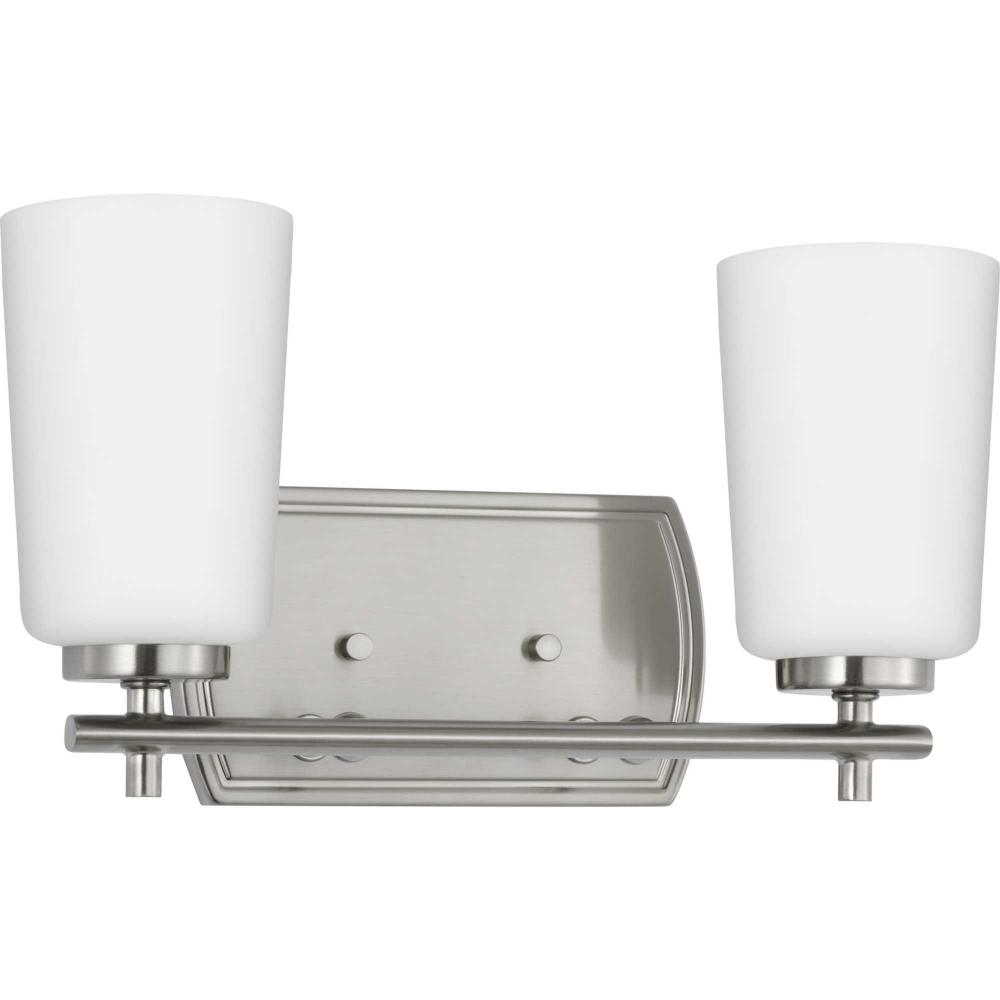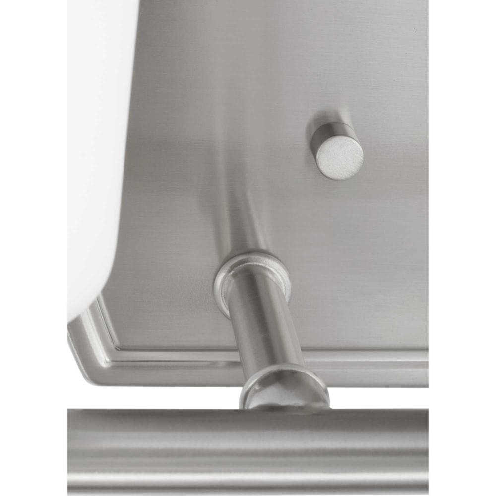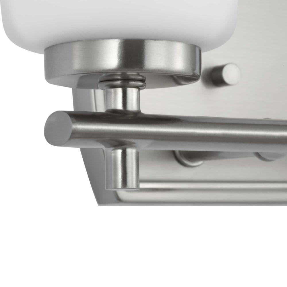 Fundamentally modern but with a traditional twist, the Adley vanity light combines opal glass shades with a curved edge backplate and a simple, straight bar finished in soft brushed nickel. This light is an elegant choice for illuminating new traditional and transitional settings.