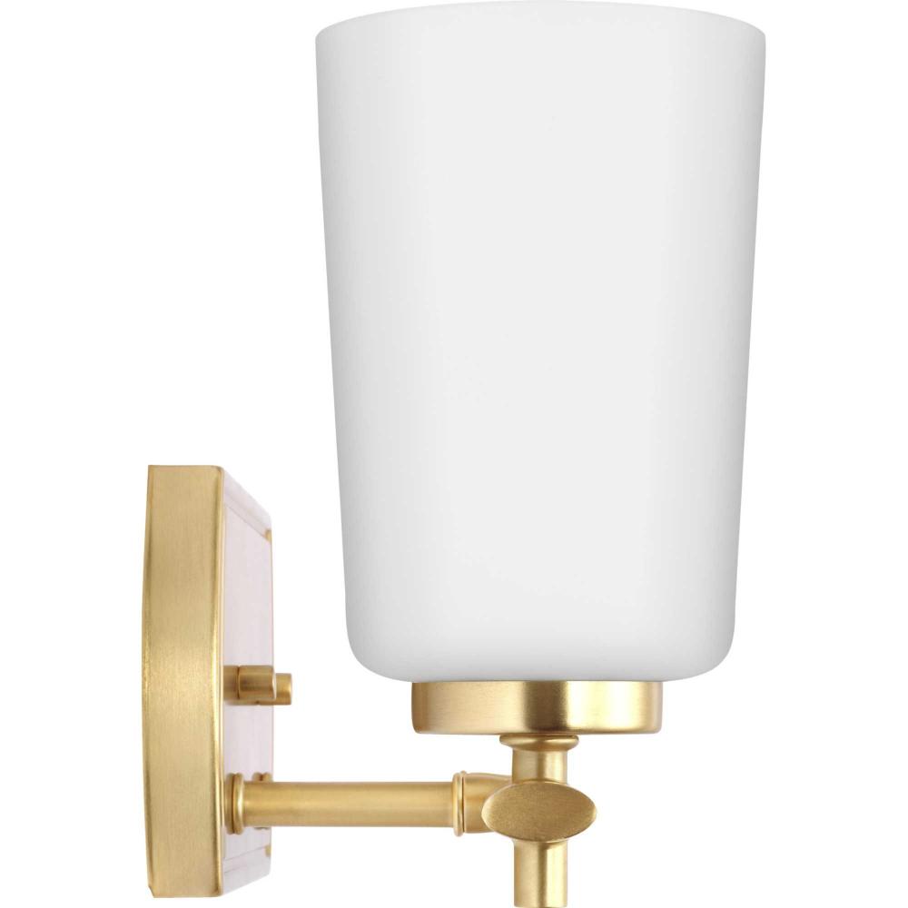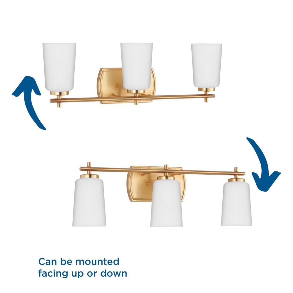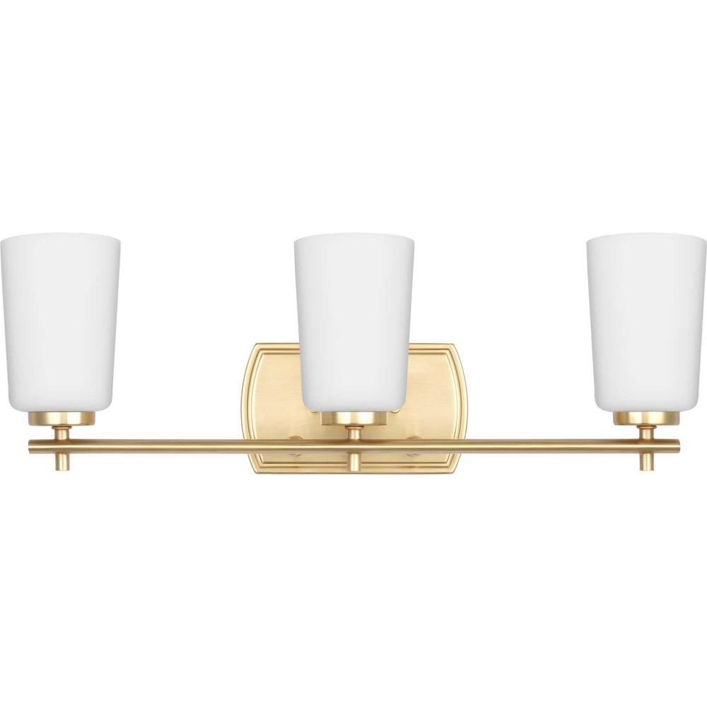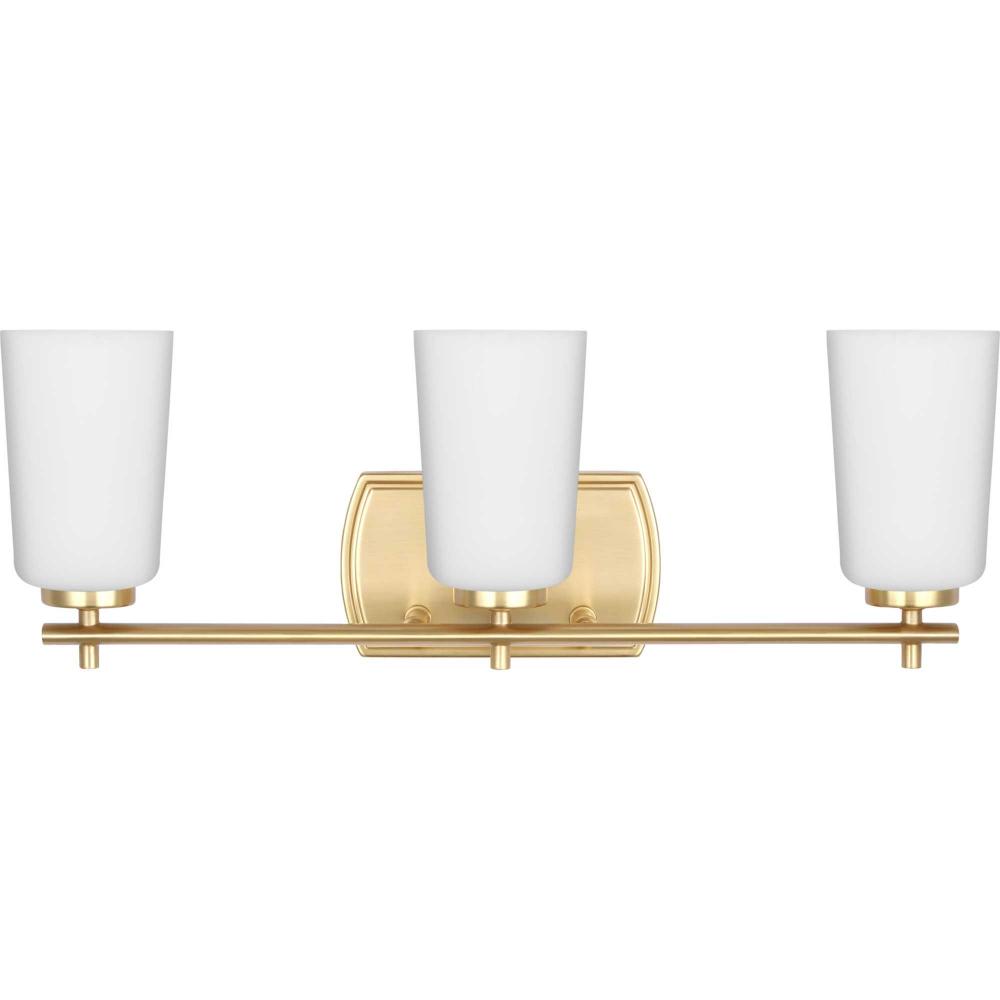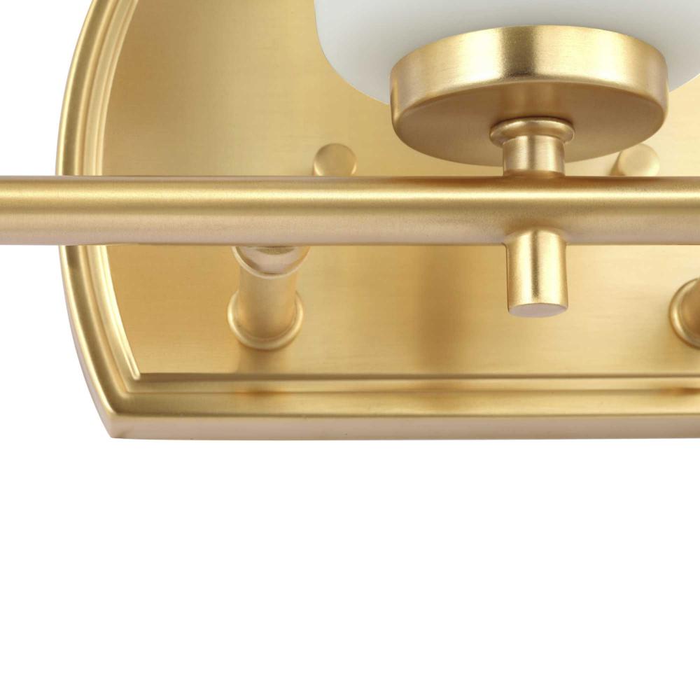 Fundamentally modern but with a traditional twist, the Adley vanity light combines opal glass shades with a curved edge backplate and a simple, straight bar finished in lustrous satin brass. This light is an elegant choice for illuminating new traditional and transitional settings.