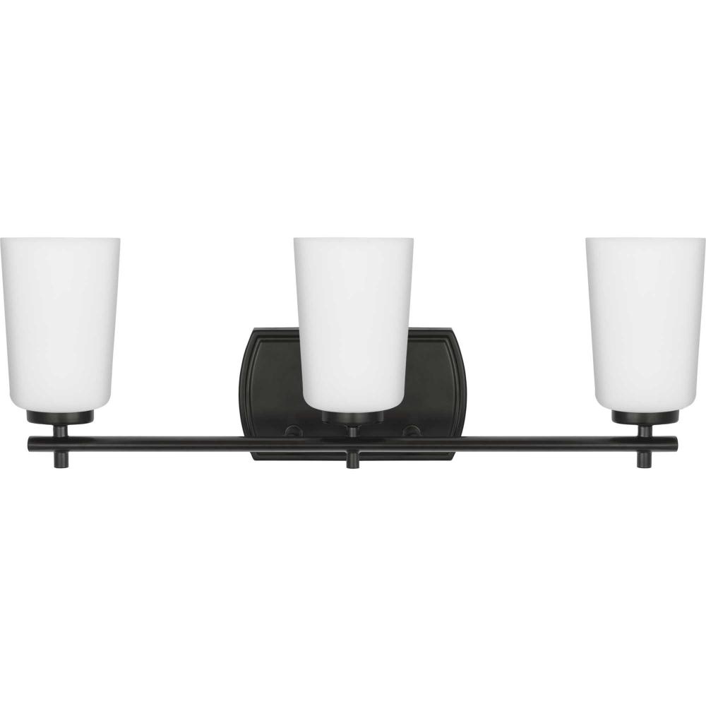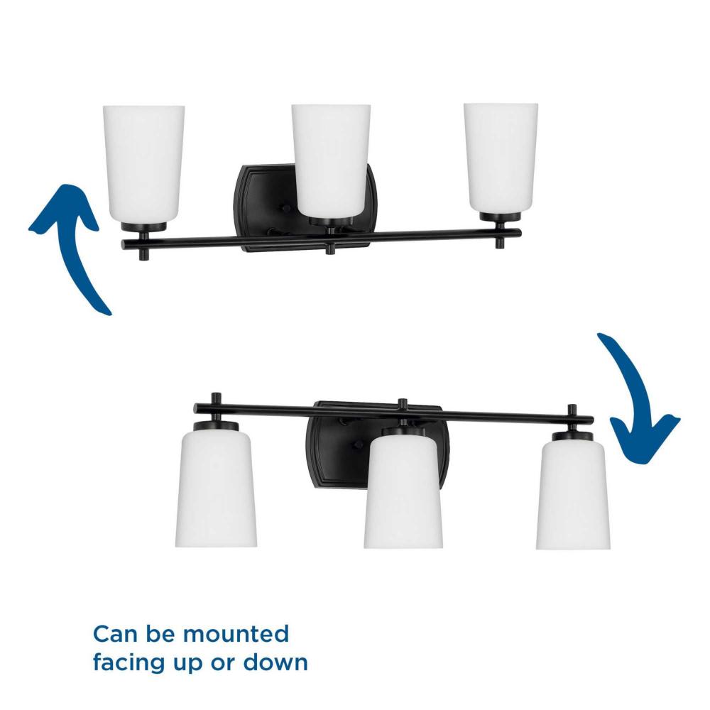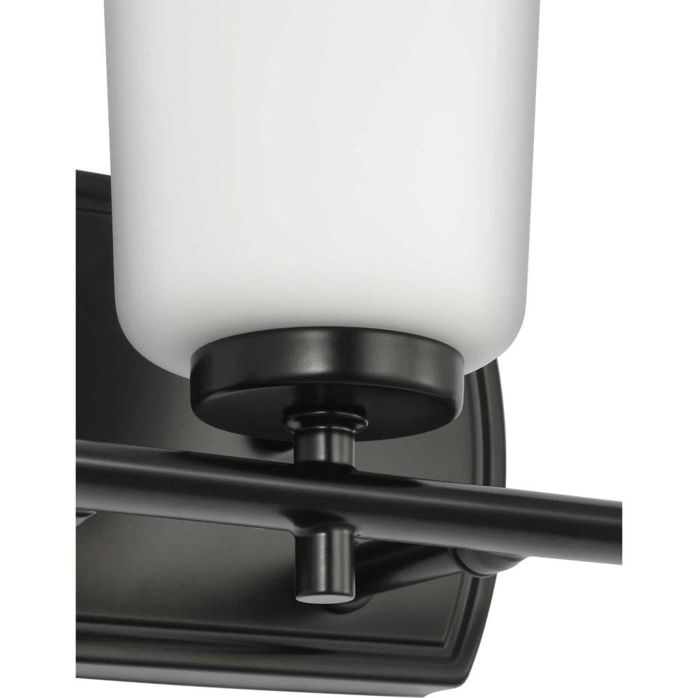 Fundamentally modern but with a traditional twist, the Adley vanity light combines opal glass shades with a curved edge backplate and a simple, straight bar finished in crisp matte black. This light is an elegant choice for illuminating new traditional and transitional settings.