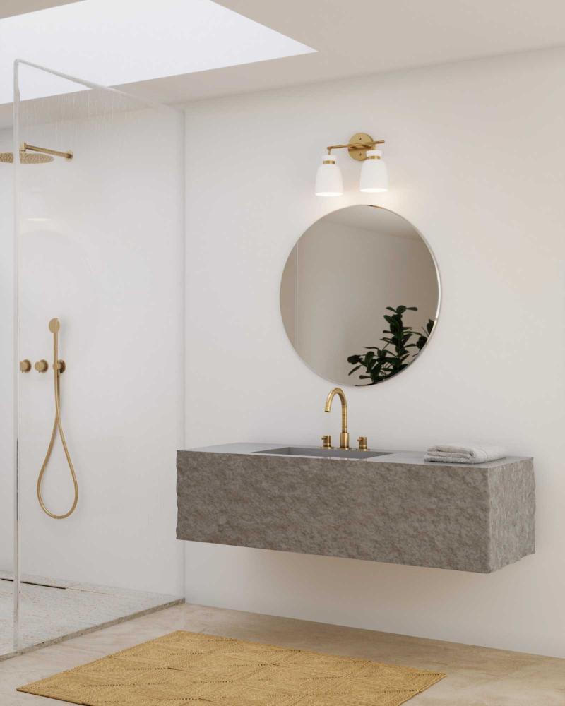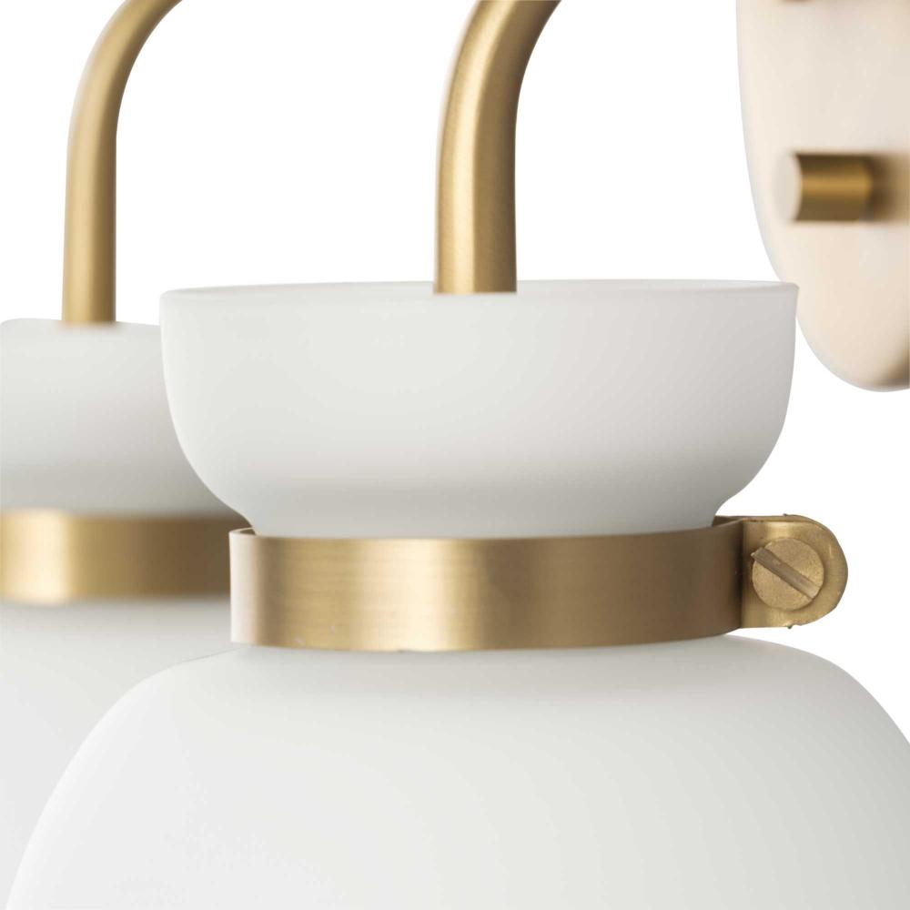 The Lexie Two-Light Vanity Light is full of spunk with a fresh new style for todays home. A slender minimalist frame finished in Brushed Gold supports opal glass shades with a distinctive cinched metallic collar.The versatile fixture can be mounted facing up or down, offering the perfect amount of illumination to the room.