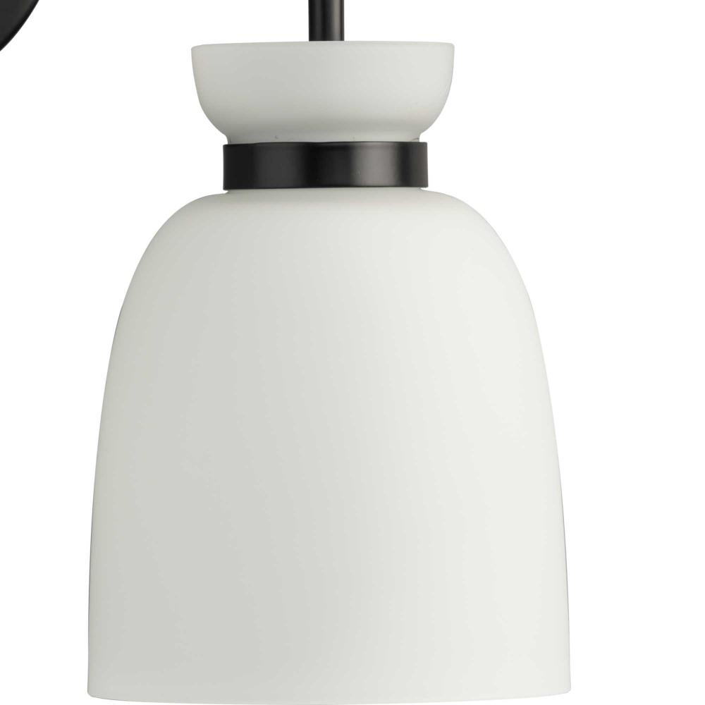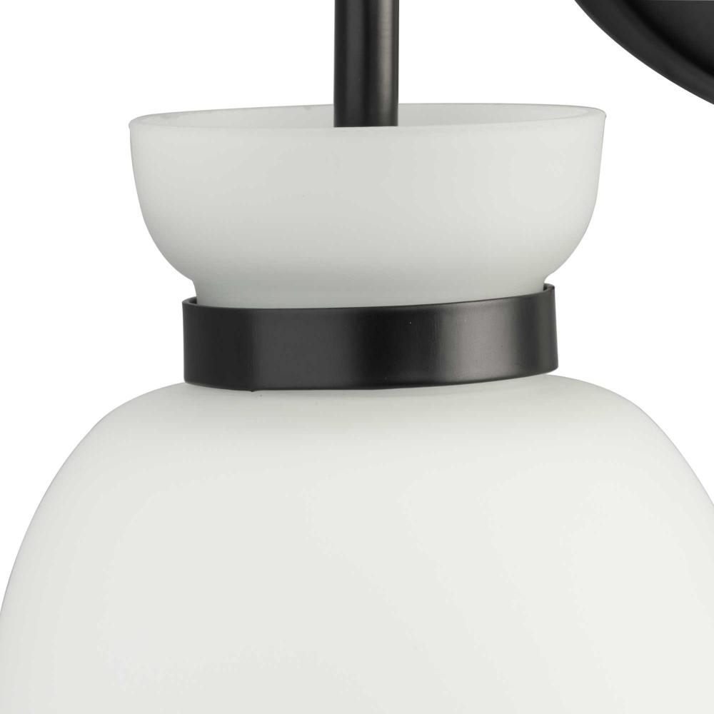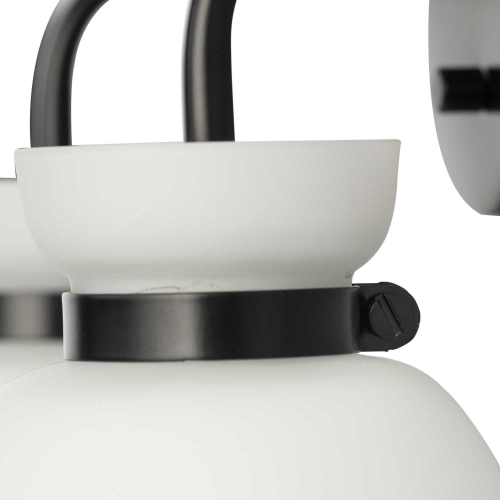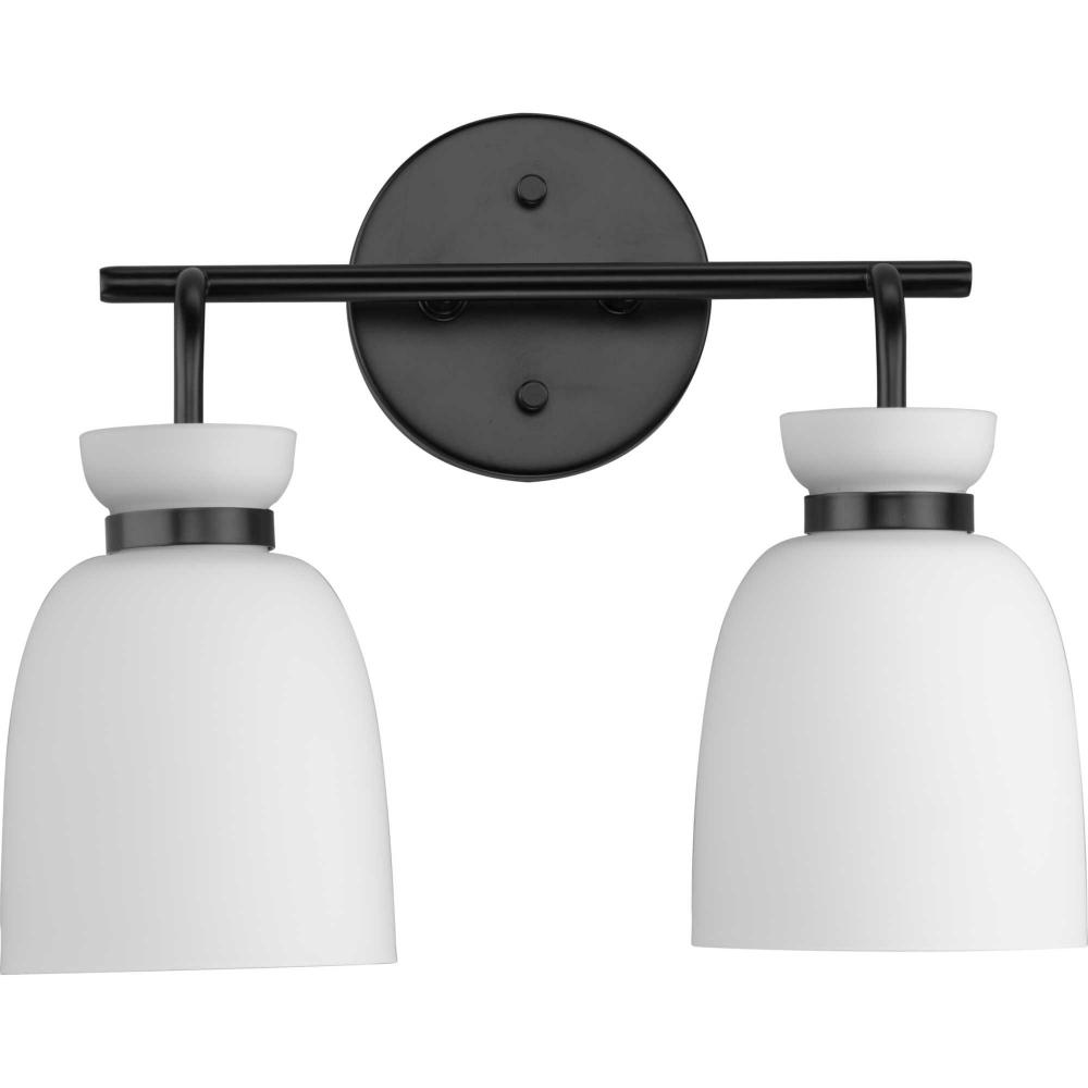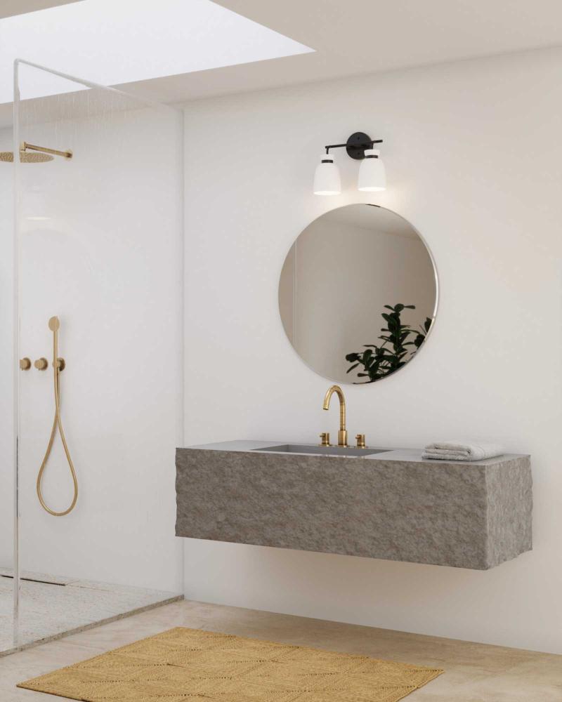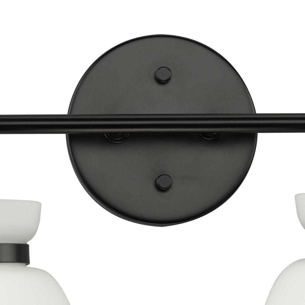 The Lexie Two-Light Vanity Light is full of spunk with a fresh new style for todays home. A slender minimalist frame finished in Matte Black supports opal glass shades with a distinctive cinched metallic collar.The versatile fixture can be mounted facing up or down, offering the perfect amount of illumination to the room.