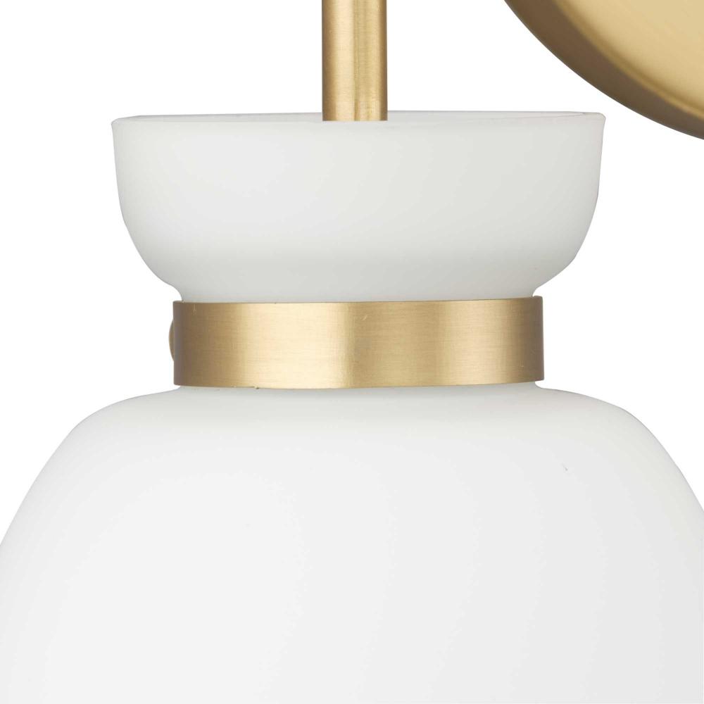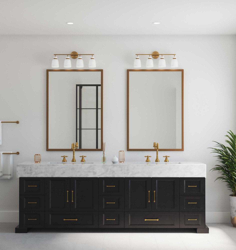 The Lexie Four-Light Vanity Light is full of spunk with a fresh new style for todays home. A slender minimalist frame finished in Brushed Gold supports opal glass shades with a distinctive cinched metallic collar.The versatile fixture can be mounted facing up or down, offering the perfect amount of illumination to the room.