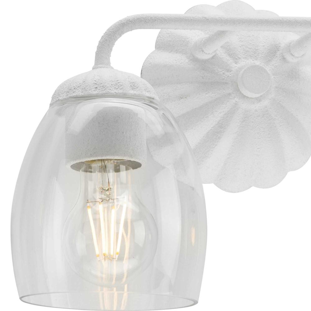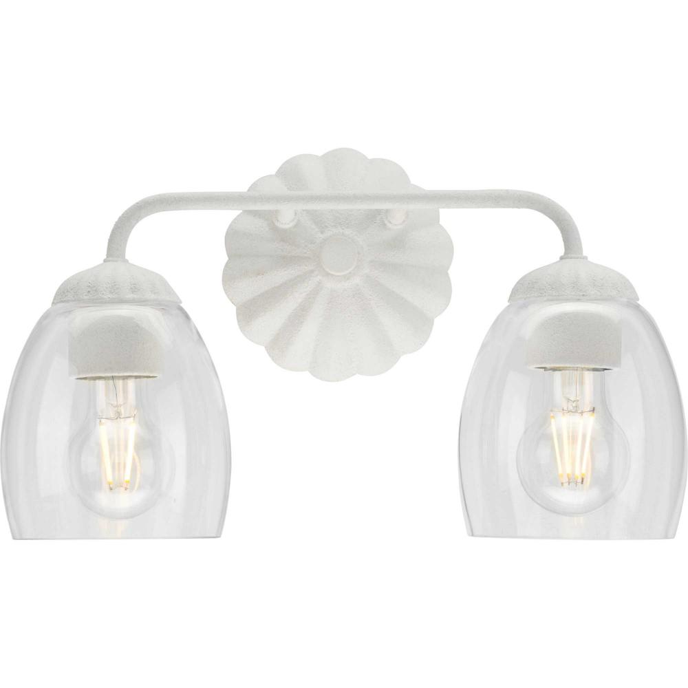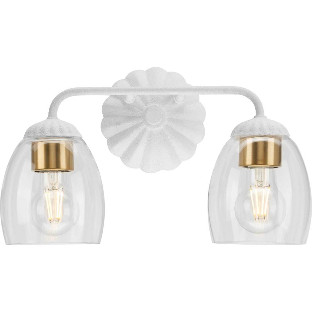The Quillan Two-Light Vanity Light offers a graceful flourish to add distinctive designer touch. Scalloped elements create a richness of detail to complement the clarity of clear, elliptical glass shades. Each fixture includes both matching and contrasting accent rings. This versatile light can be mounted up or down to provide clear illumination to the room.