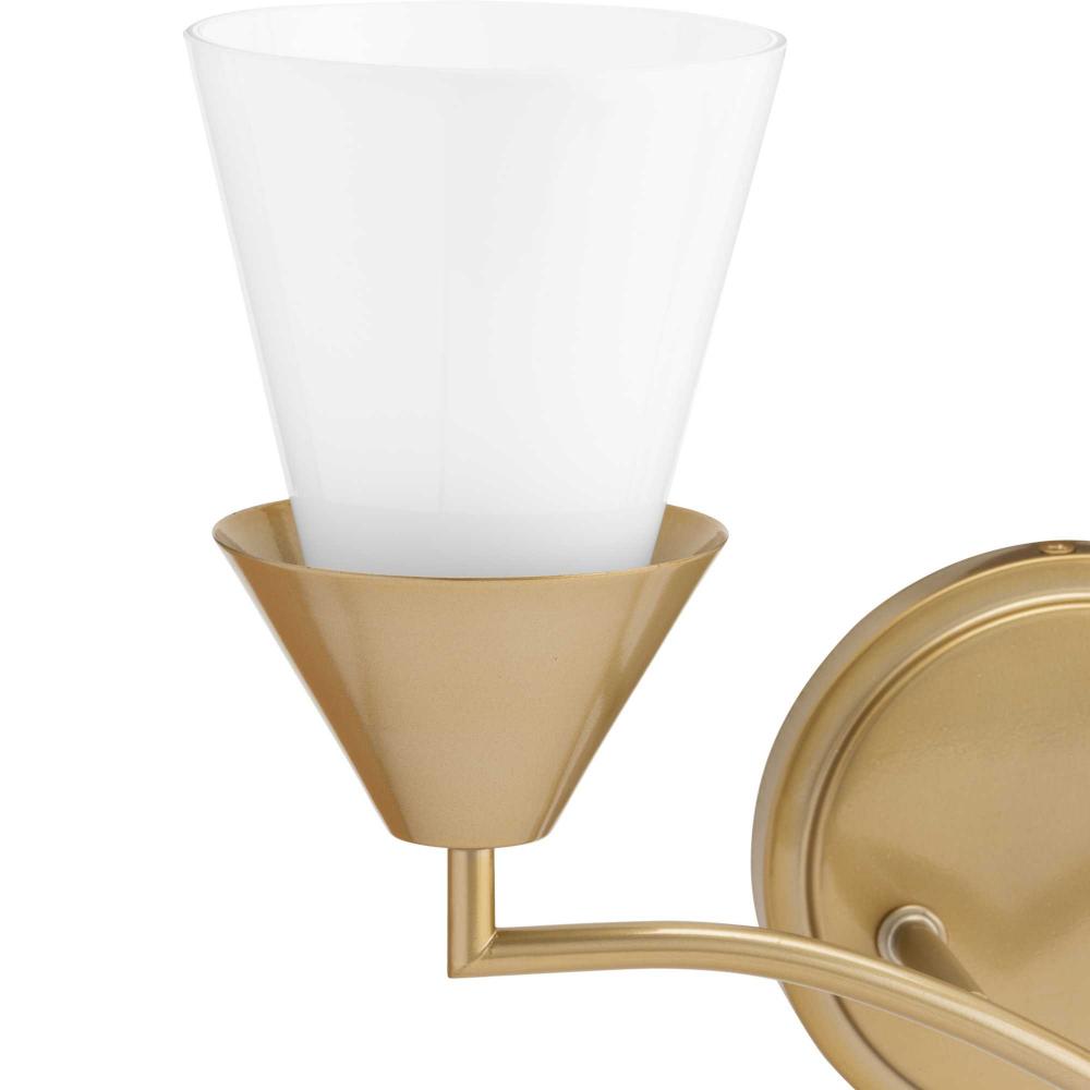 The Pinellas Vanity Light gets to the point with a modern expression of a timeless form. The signature dual conical motif coated in a beautiful Soft Gold finish has the elements artfully nested together to provide a pleasing diffusion of light. This fixture is part of the Progress Lighting Design Series, a lighting collection offering fashionable styles and luxury lighting for the home.