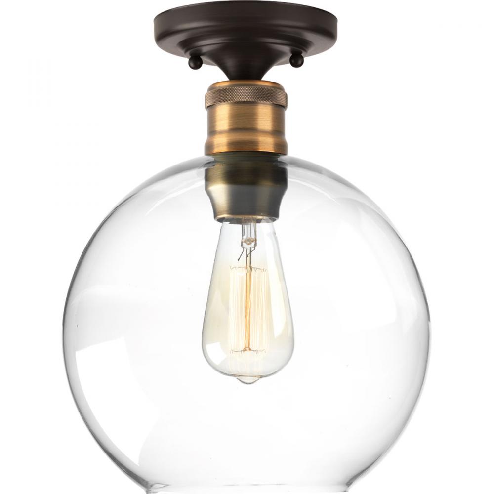 The Hansford collection of fixtures feature a clear, spherical shade paired with vintage style metal fittings in an antique bronze and brass combination finish. Featuring a clean and precise design with generous scale, Hansford's classic style brings tranquility to your home with. Hansford lends itself to Farmhouse, Coastal or Industrial interiors. Can be used with clear or vintage bulbs for a variety of looks. The one-light flush mount is ideal for bedrooms, bathrooms, hallways and closets.