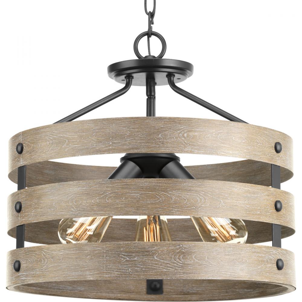 Graphite finish.;Three circular bands wrap together to form open design.;Hand painted to emulated weathered driftwood.;Accented by smooth knobs and exposed bulbs.;Ideal for rustic farmhouse decor.;Fixture can be chain hung or semi-flush to ceiling.