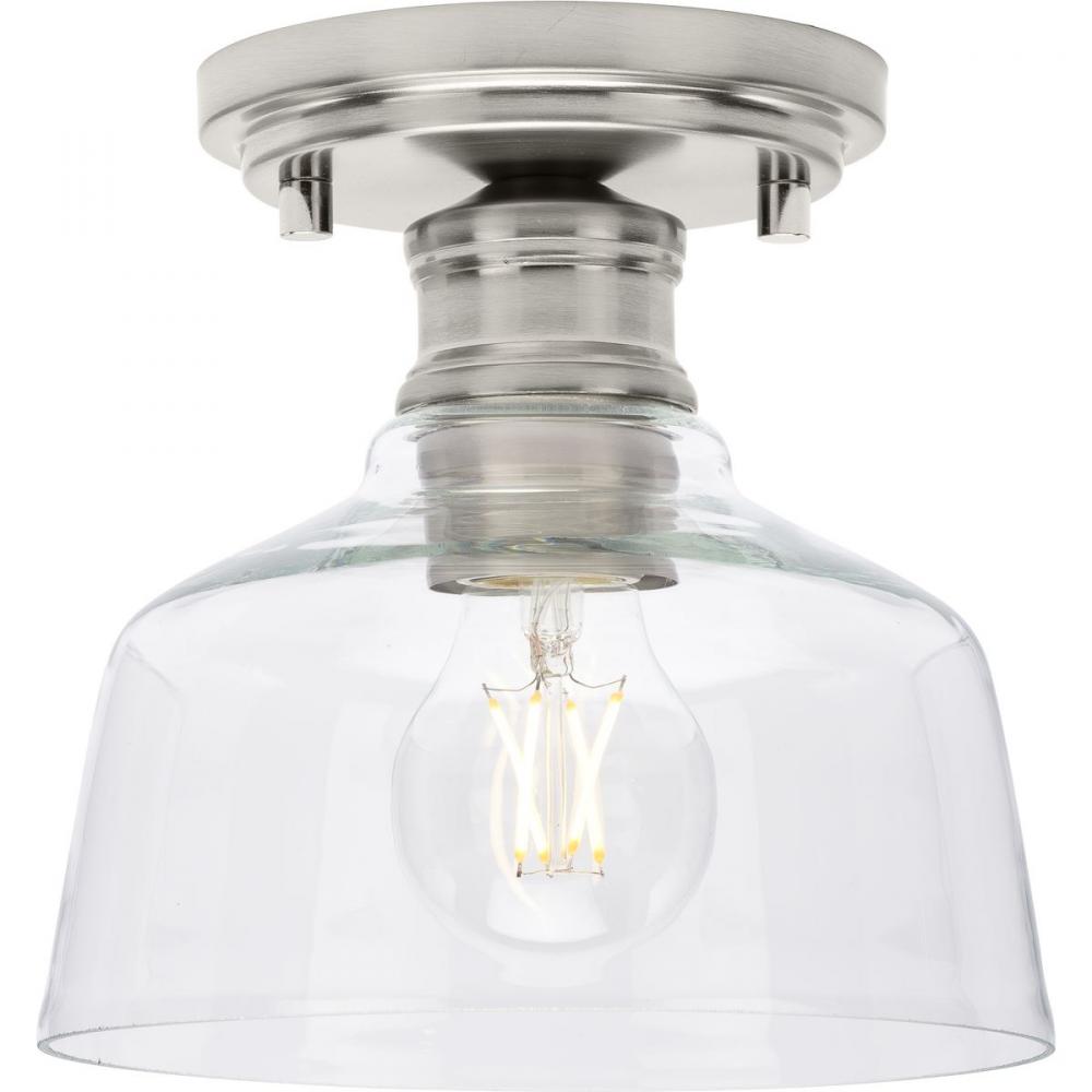 The Singleton Collection 1-light small semi-flush mount fixture pays homage to industrial styling with an oversized warehouse shade fabricated from clear glass. A round backplate and vintage-inspired metal fittings finished in subtle brushed nickel create a timeless design. The warehouse-style glass shade is the perfect showcase for clear decorative light bulbs (not included) to enhance the fixture's charming style. This beautiful ceiling light delivers optimal ambient lighting for bathrooms, bedrooms, hallways and foyers.