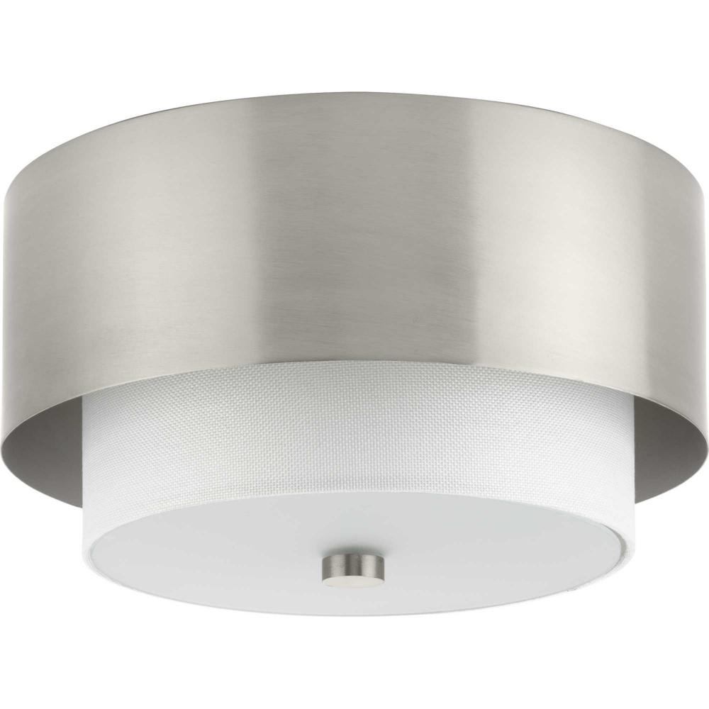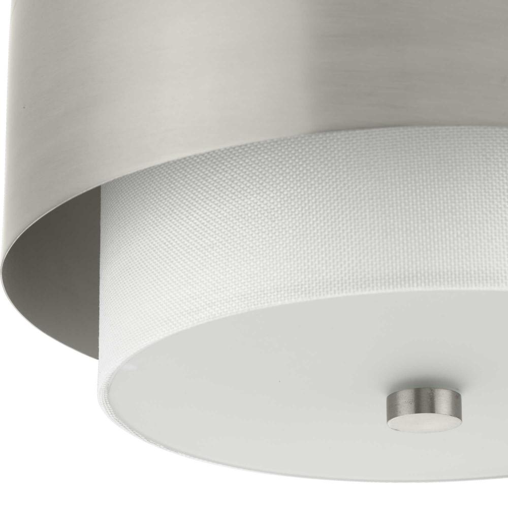 The Silva Collection uses a dramatic contrast of finish and material to present a captivating design. A white linen shade encompassed by a stunning metallic drum coated in a subtle brushed nickel finish establishes a clean, modern, uplifting statement. This fixture is part of the Progress Lighting Design Series, a lighting collection offering fashionable styles and affordable luxury lighting for the home.