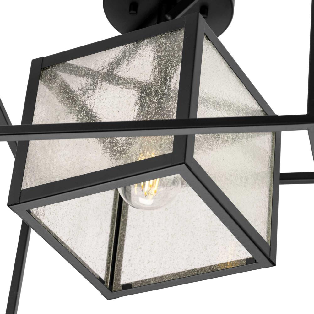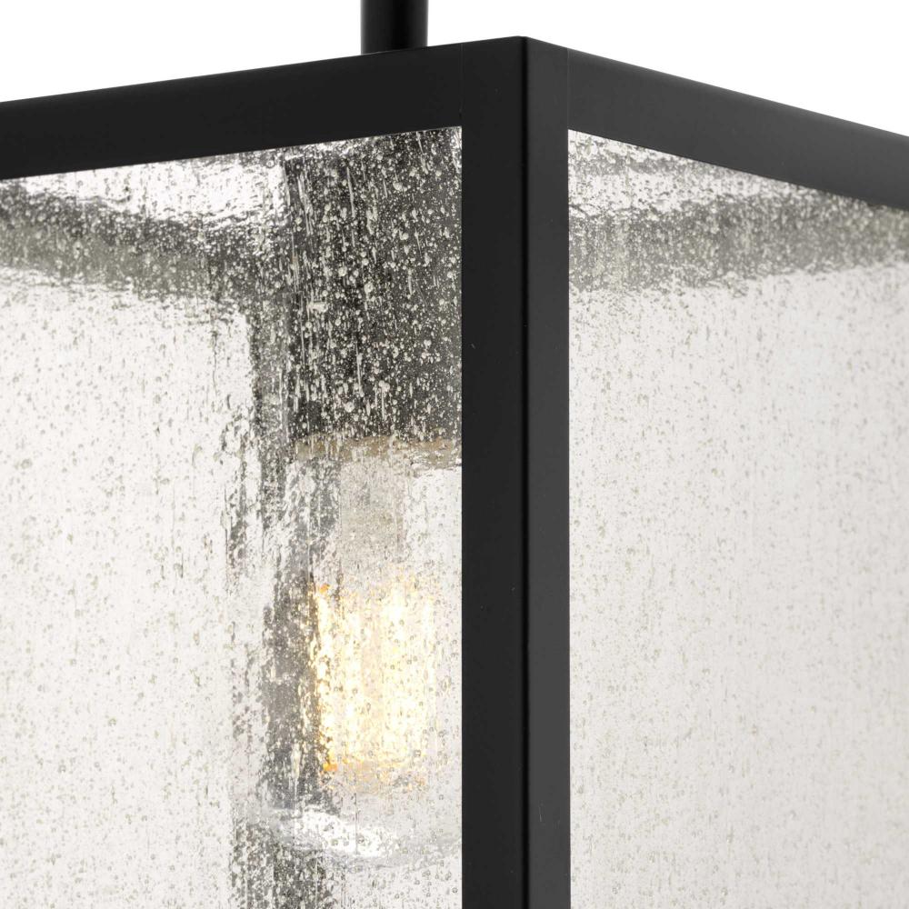 Define your favorite gathering spaces with the Navarre Collection 1-Light Matte Black Seeded Glass Transitional Outdoor Hanging Pendant Light. Rectangular cubes nest within each other, forming a breezy angular silhouette coated in a classic matte black finish. Shimmering seeded glass panels captured within a square frame cast a pleasing glow from the light source inside.