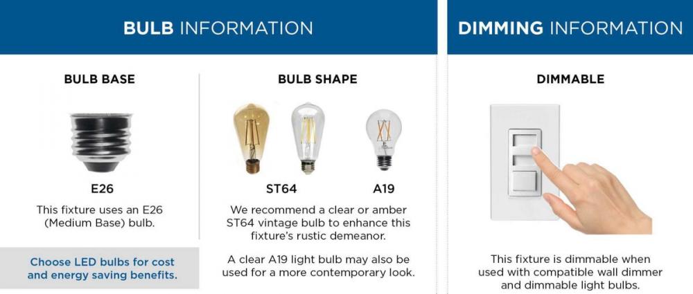 Uses (1) 60-Watt maximum, medium base bulbs or LED equivalent, that is sold separately, and dimmable when used in conjunction with a dimmable bulb