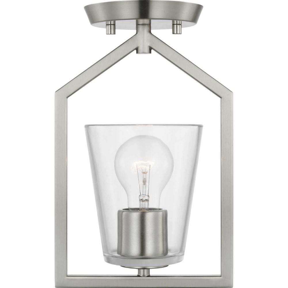 The semi-flush mount is finished in a gorgeous plated brushed nickel