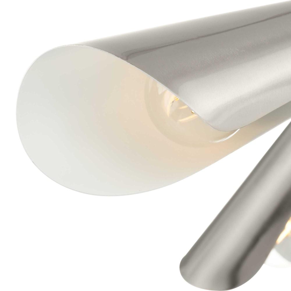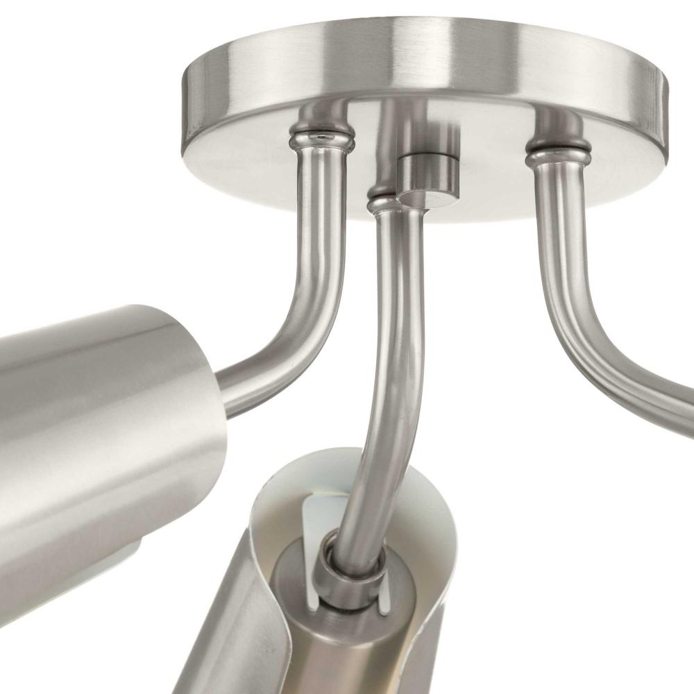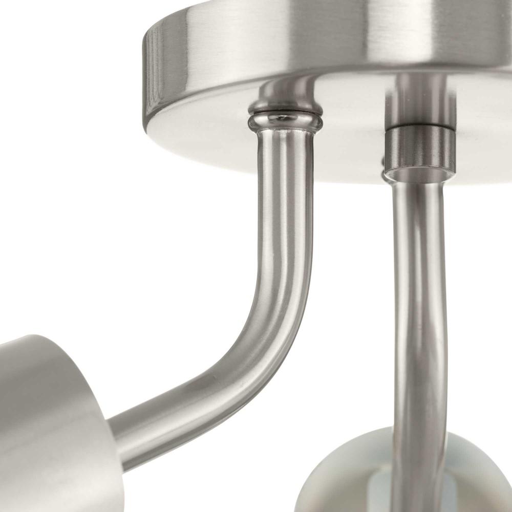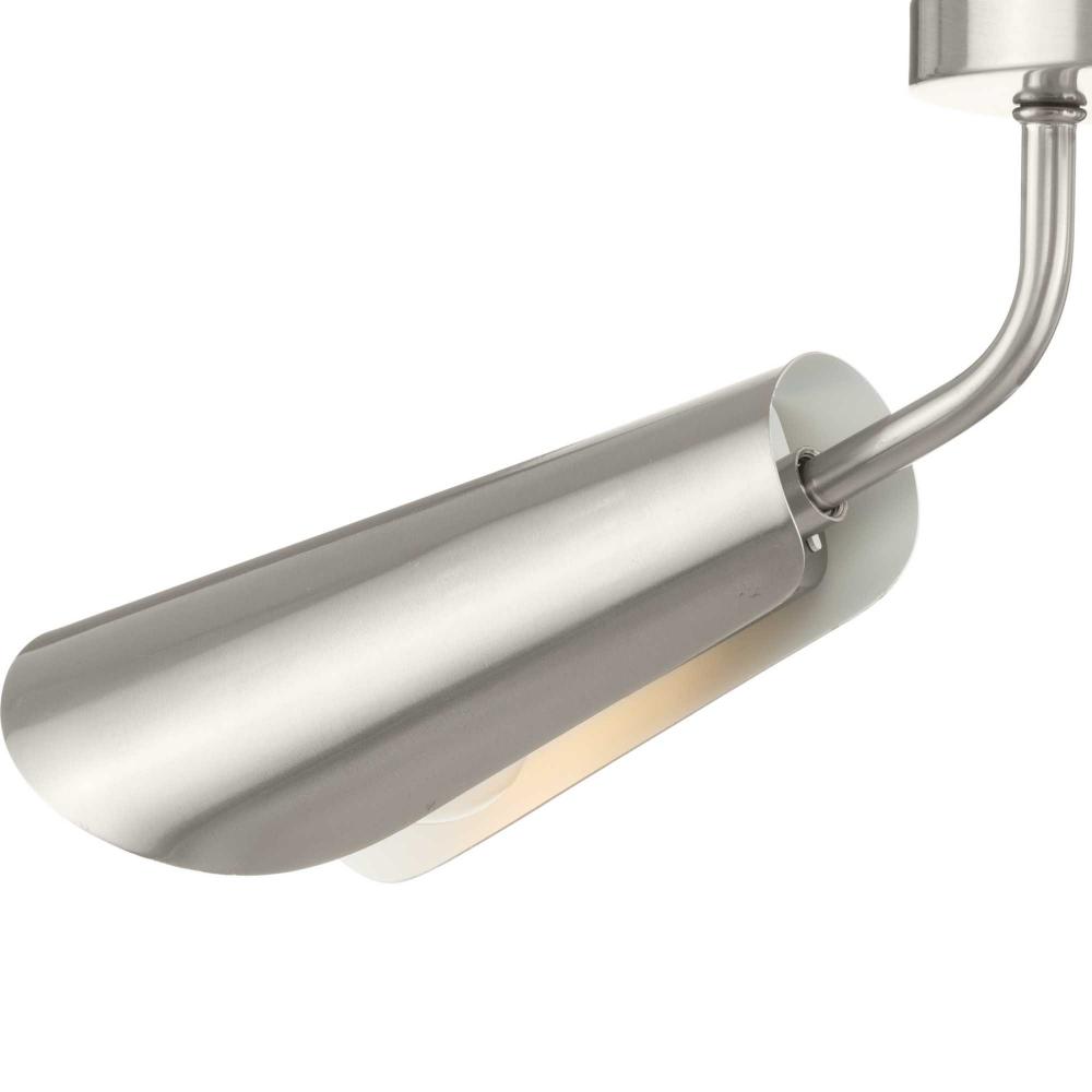 Cornett trumpets its arrival on the scene with a blending of timeless modern design. The Close-to-Ceiling fixture features dynamic angles finished in Brushed Nickel, offering a dramatic counterpoint to the softly sculpted curves of the matching metal reflector shades.Light is directed out and downwards from its unique, curved construction.