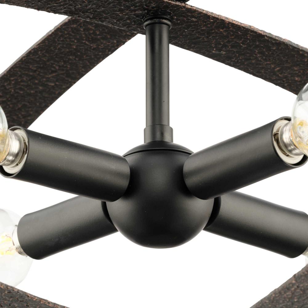 Its rustic frame is finished in a textured Iron Copper with Matte Black light cluster