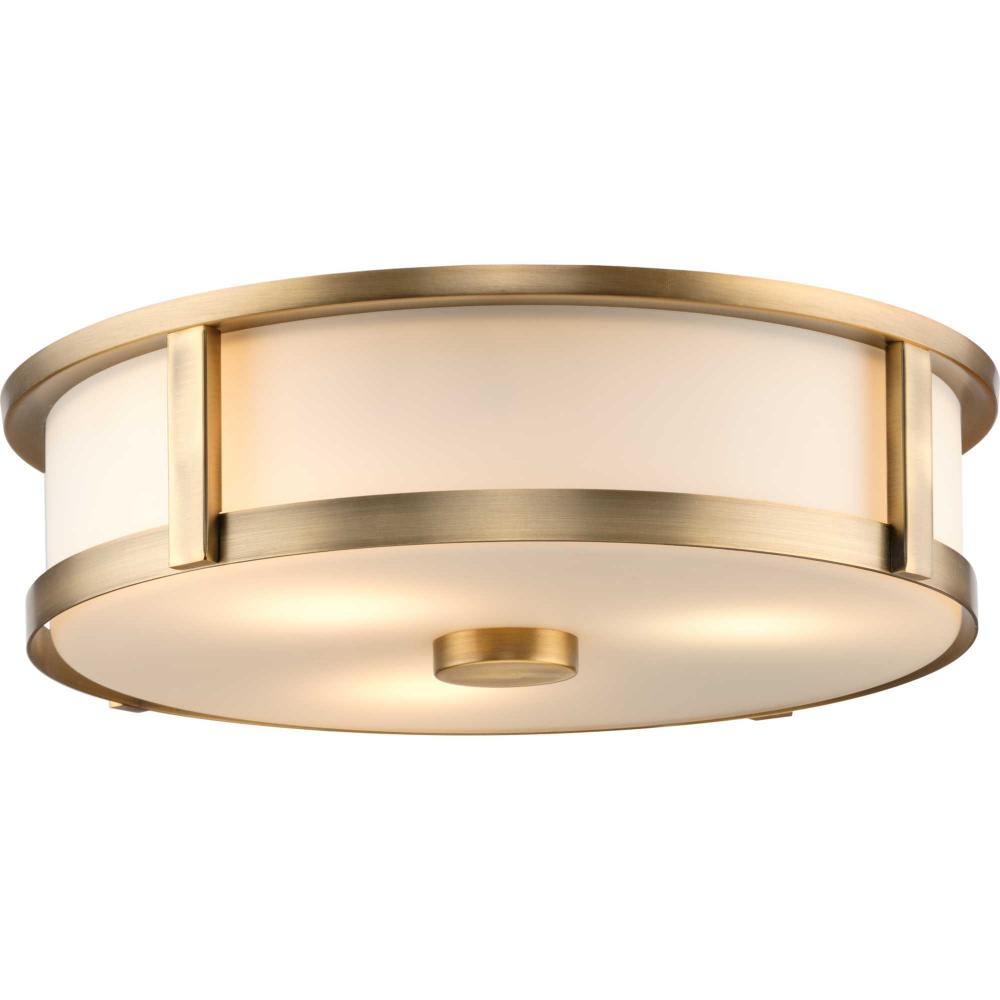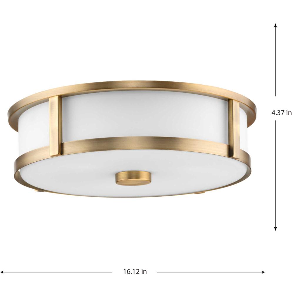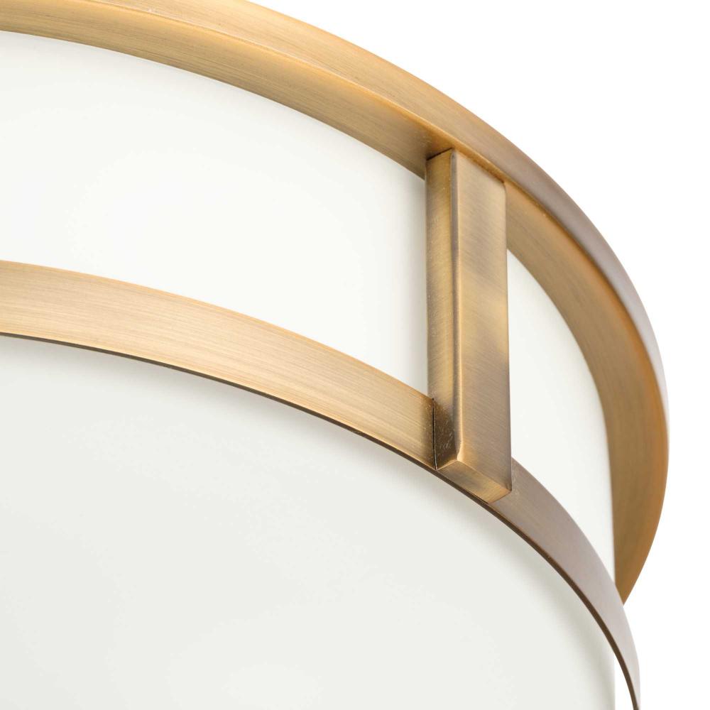 The Gilliam Flush Mount delivers an ethereal quality expressed by its slim circular silhouette finished in Vintage Brass. Etched white curved glass enhances the ceiling light’s classic form with simple elegance. The 16 inch diameter light is perfect where a larger flush mount is needed.