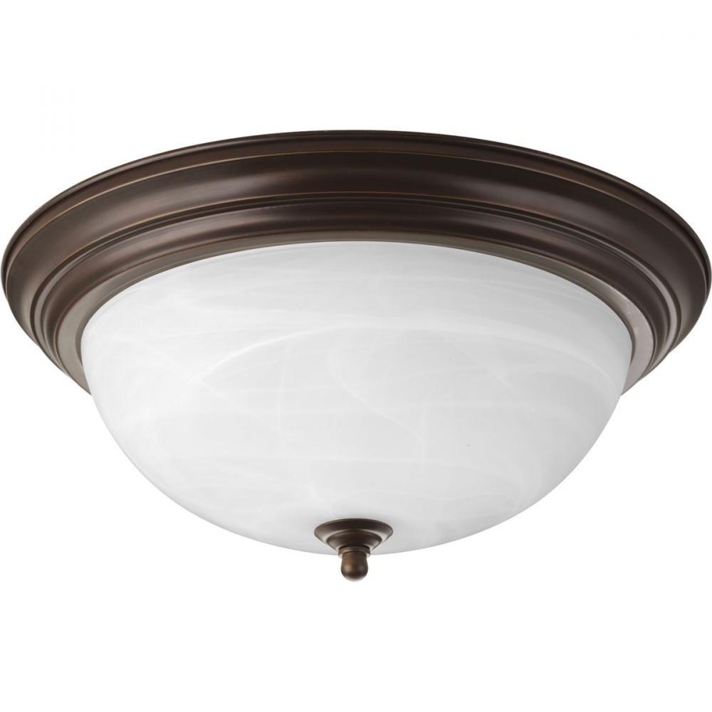 Three-light flush mount with dome shaped alabaster glass, solid trim and decorative knobs. Center lock-up with matching finial. Antique Bronze finish.