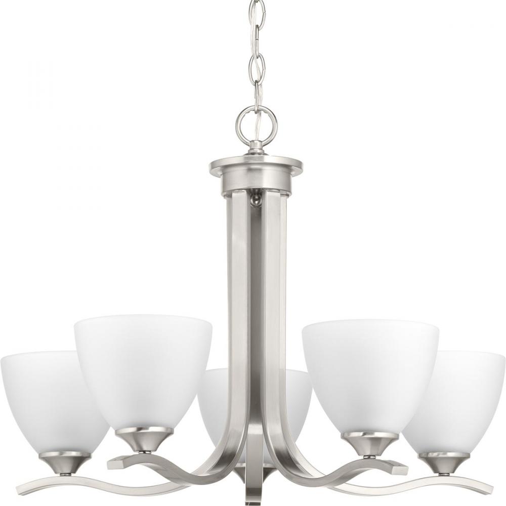 Provides a contemporary complement to casual interiors popular in today's homes;Ideal for transitional design styling;Shown in Brushed Nickel finish;Glass shades add distinction and provide pleasing illumination;Scrolling arms create an airy effect;Use