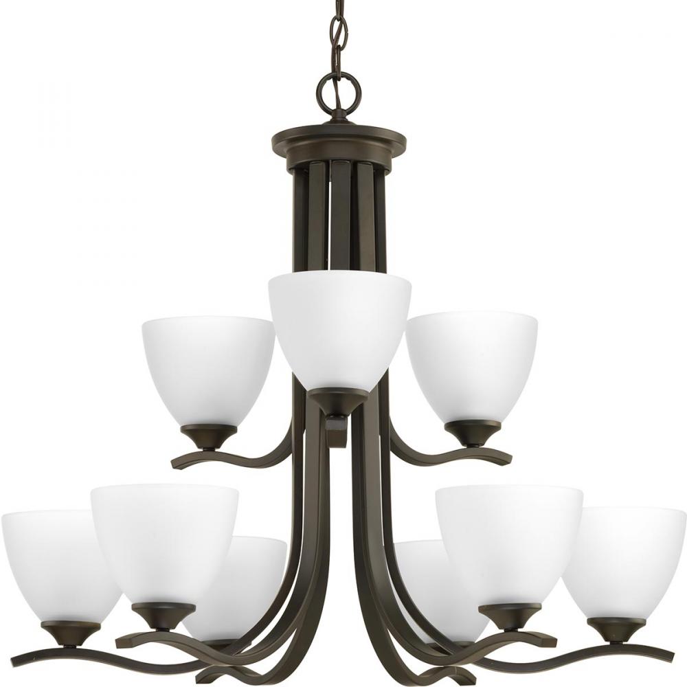 Provides a contemporary complement to casual interiors popular in today's homes;Ideal for transitional design styling;Shown in Antique Bronze finish;Glass shades add distinction and provide pleasing illumination;Scrolling arms create an airy effect;Use