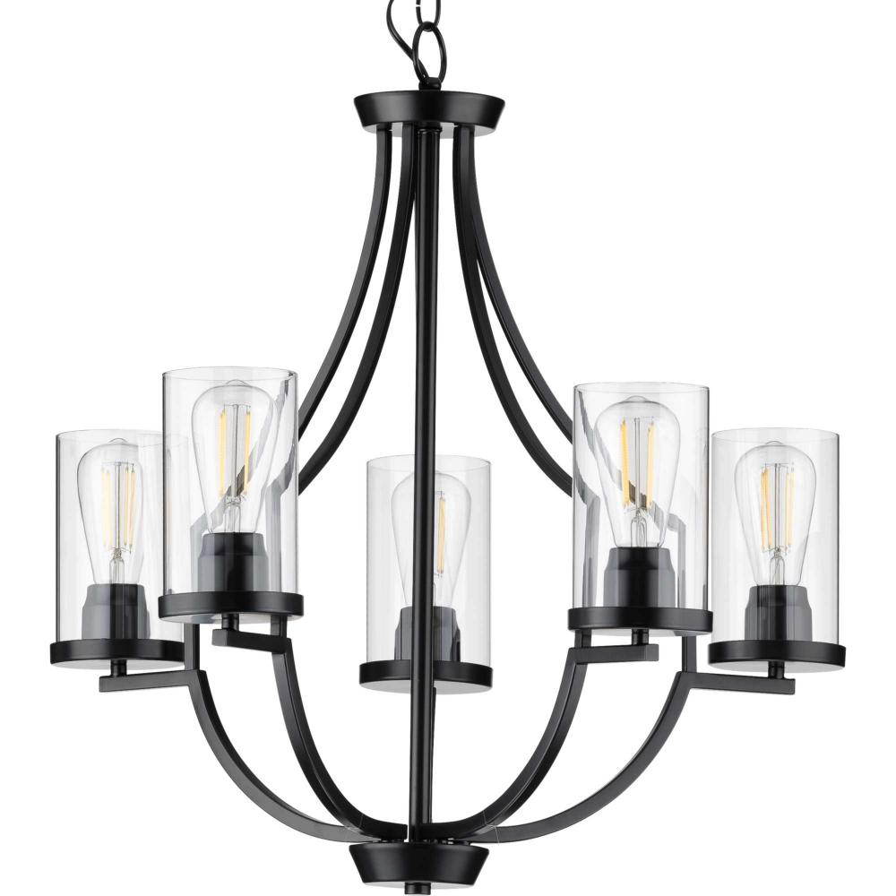 Manifest a swoon-worthy lighting experience with the stunning blend of the modern and traditional styles in this one-of-a-kind chandelier. Square tubing with clean, sharp angles is coated in a beautiful matte black finish that demands your attention. Striking vintage light sockets boast their bold yet simple demeanor as they hold clear glass shades to complete this statement-making light fixture.