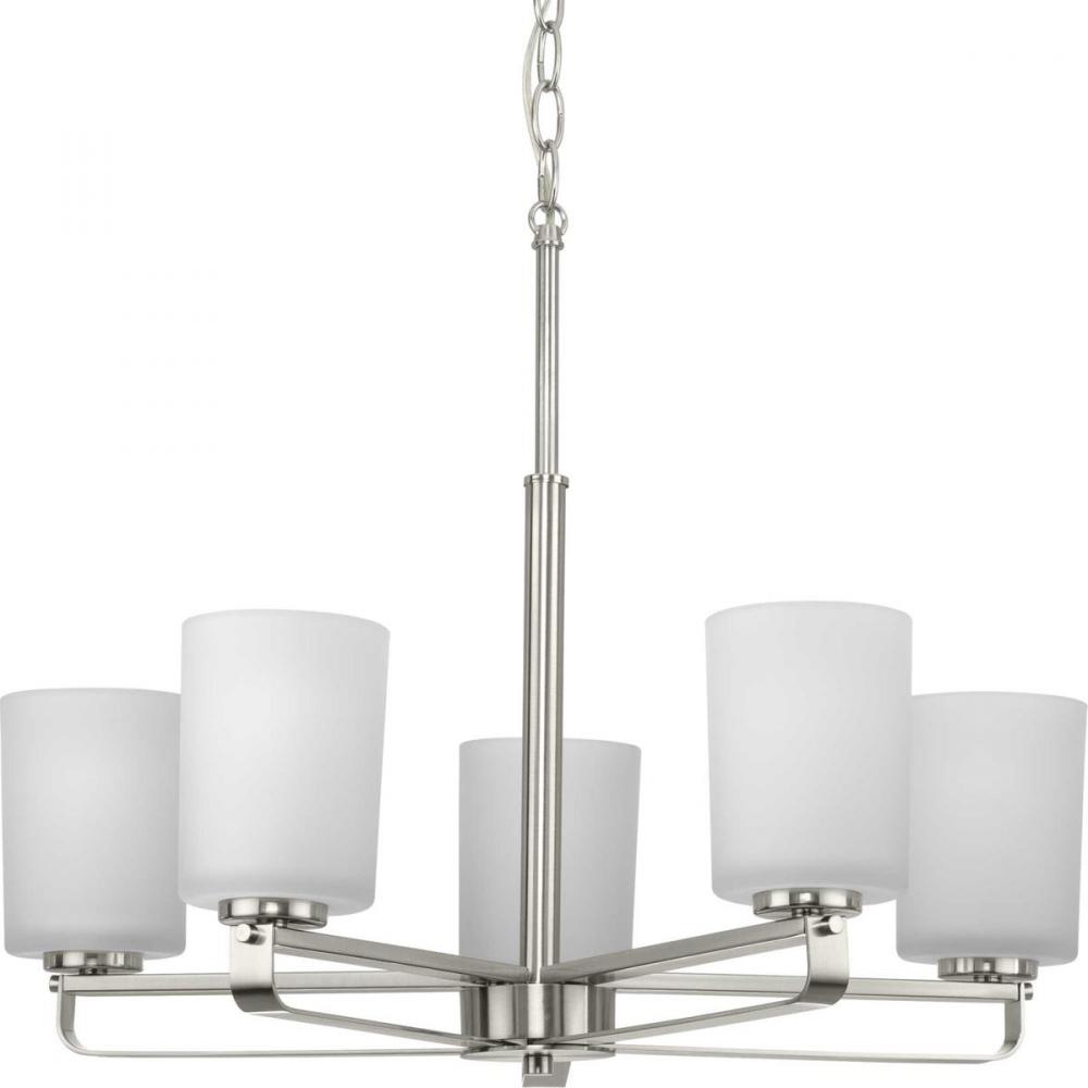 Distinguish your home with clean modern design with the League Collection Five-Light Brushed Nickel and Etched Glass Modern Farmhouse Chandelier Light ideal for any dining room, kitchen, foyer, entryway, or living room. The gracefully extended arms and sleek frame are coated in a beautiful brushed nickel finish to create a modern aesthetic. Classic etched glass shades emphasize the contrast between soft and clean.