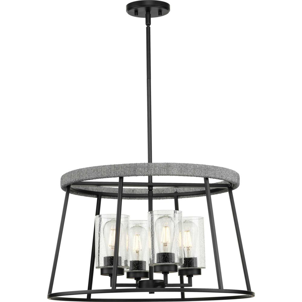 The chandelier features a cylindrical clear seeded glass shade with a crisp matte black surround