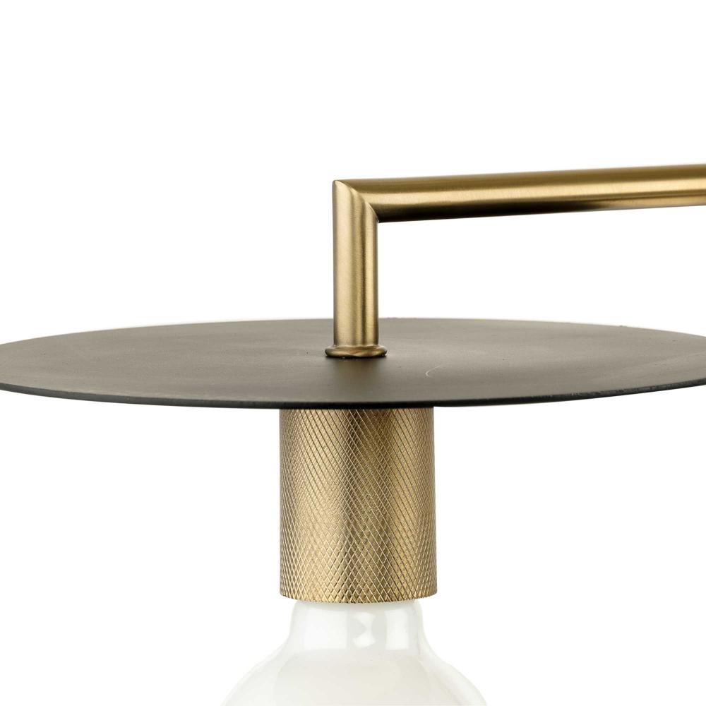 The fixture's dual-toned finish features a pairing of golden brushed bronze arms and matte black discs