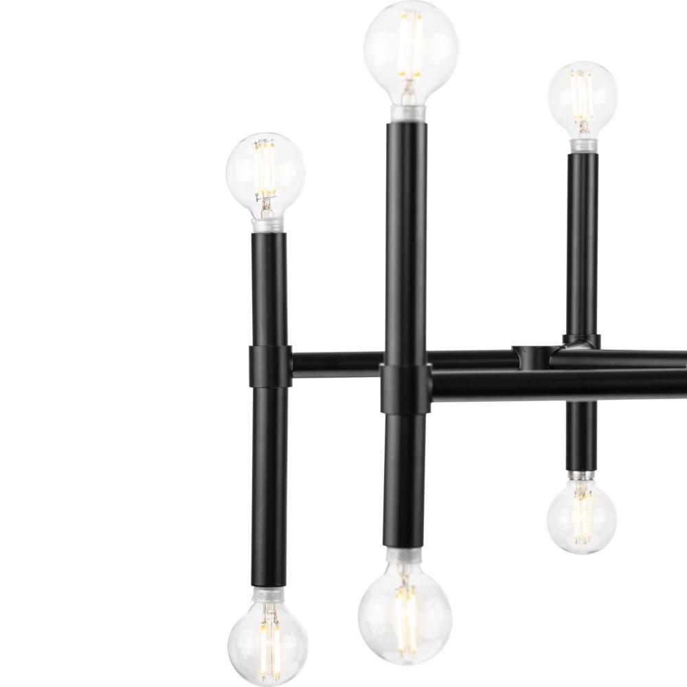The Arya Collection has a lively essence created by the rhythm of slender, graceful features. The style offers modern appeal with understated elegance.Staggered arms coated in an elegant matte black are suspended from a central axis, defining this bold architectural form. The impressive chandelier brings a modern flair to ceilings in dining rooms, bedrooms and living rooms in luxe, mid-century modern and contemporary settings. This fixture is part of the Progress Lighting Design Series, a lighting collection offering fashionable styles and affordable luxury lighting for the home.