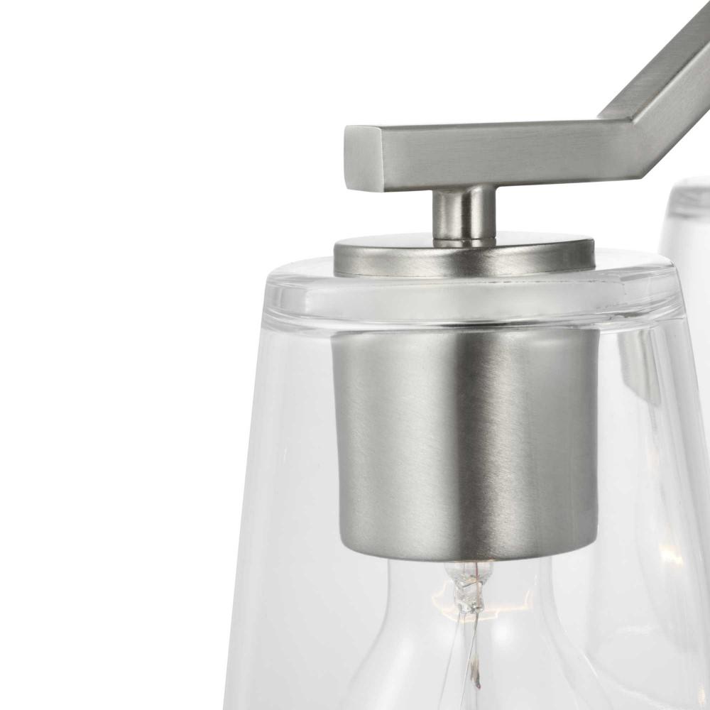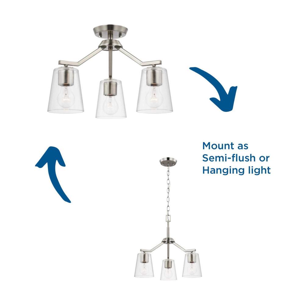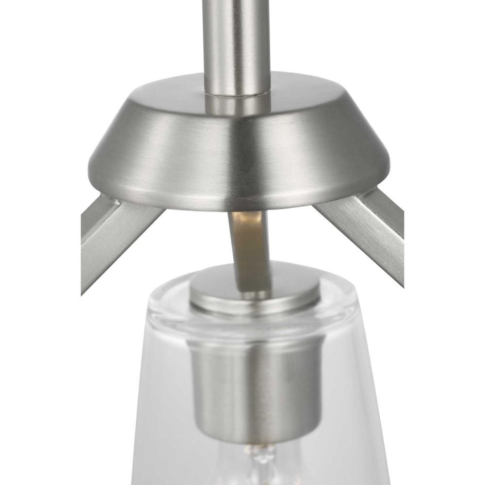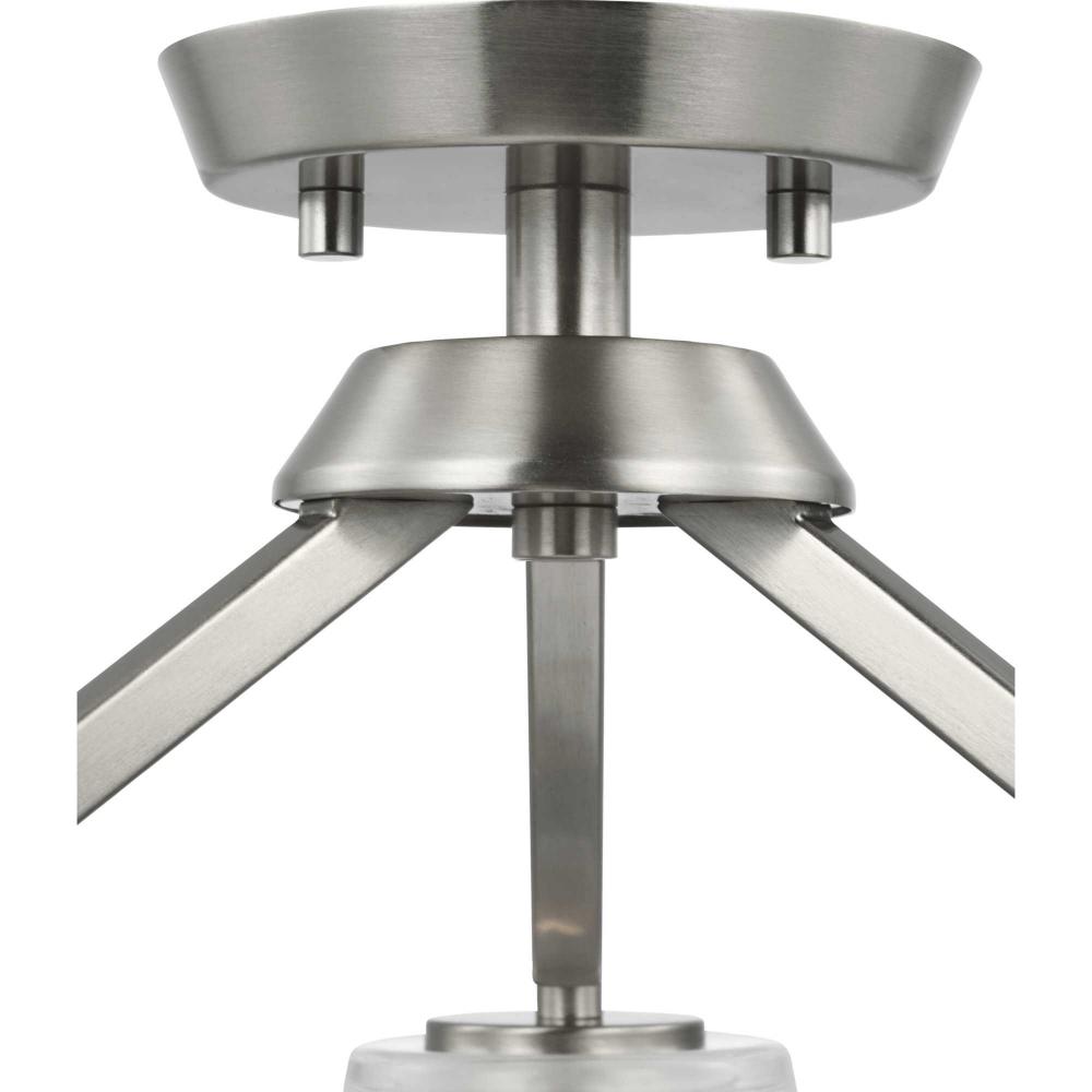 Elegantly extended, the Vertex convertible chandelier is composed of angular forms to create a bold design that perfectly complements halls, foyers and breakfast nooks in modern interiors. Its distinctive silhouette is coated in a soft brushed nickel finish. A clear glass shade offers bright illumination to spaces below. This versatile fixture can be converted to a chandelier using the included 48 inches of chain or installed as a semi-flush mount fixture.