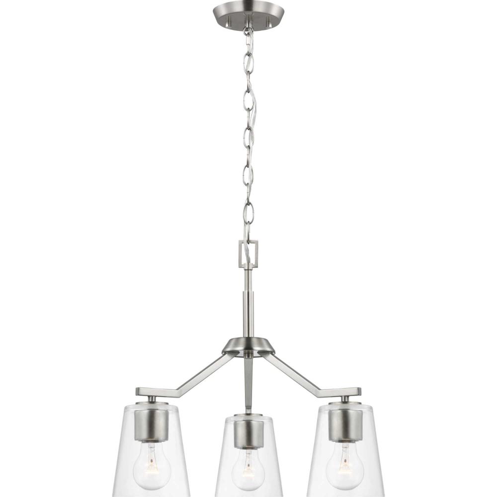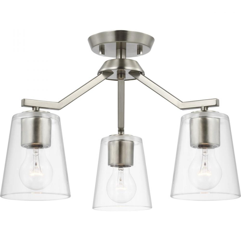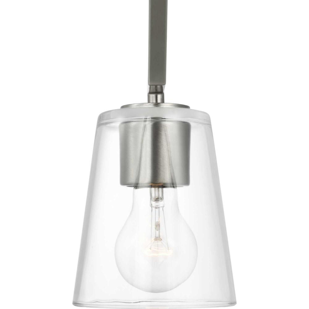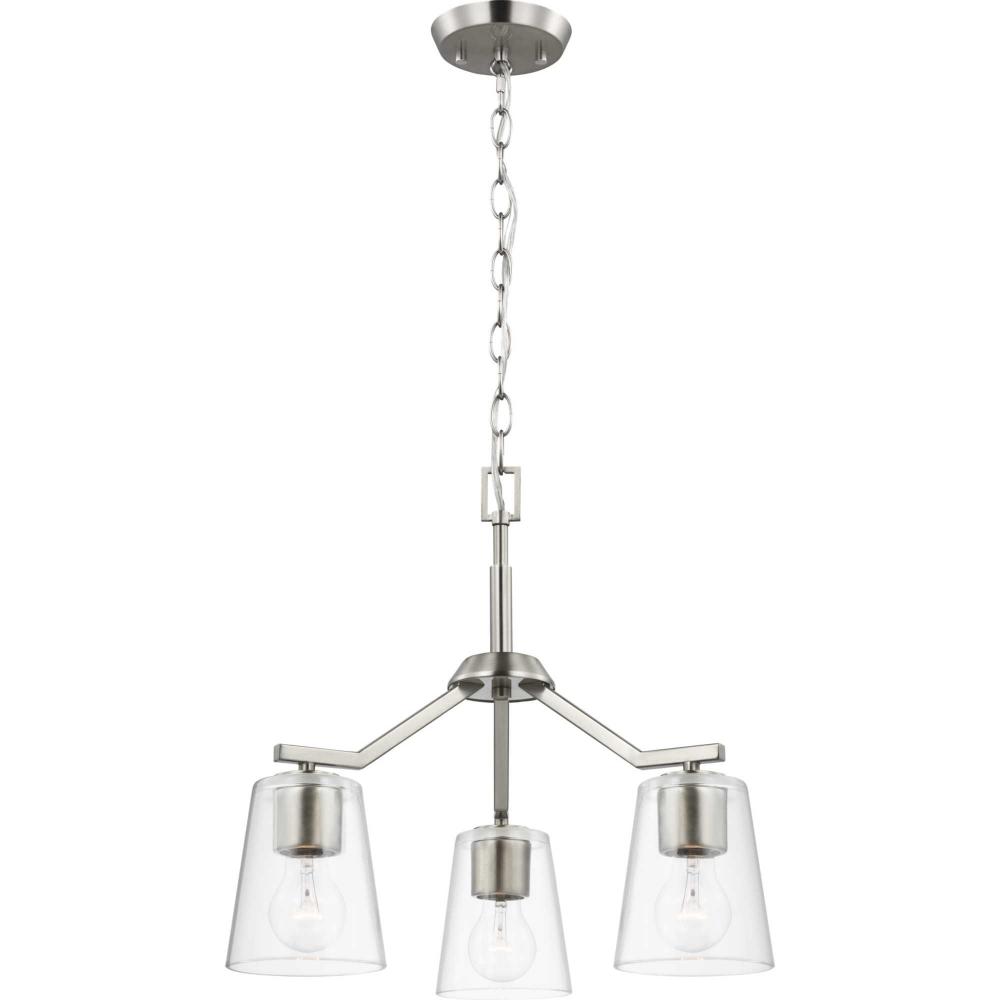 Elegantly extended, the Vertex convertible chandelier is composed of angular forms to create a bold design that perfectly complements halls, foyers and breakfast nooks in modern interiors. Its distinctive silhouette is coated in a soft brushed nickel finish. A clear glass shade offers bright illumination to spaces below. This versatile fixture can be converted to a chandelier using the included 48 inches of chain or installed as a semi-flush mount fixture.