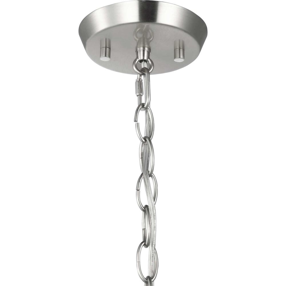 The convertible chandelier is finished in a lovely brushed nickel