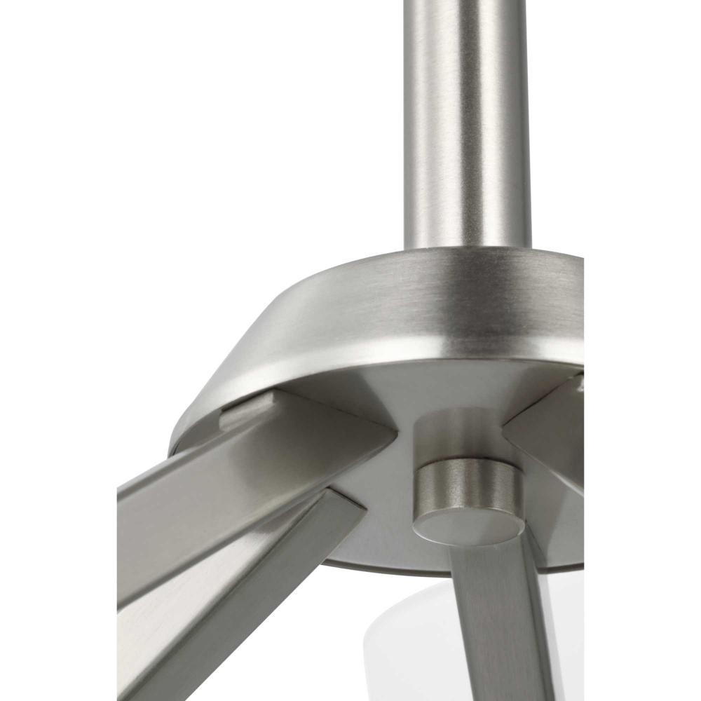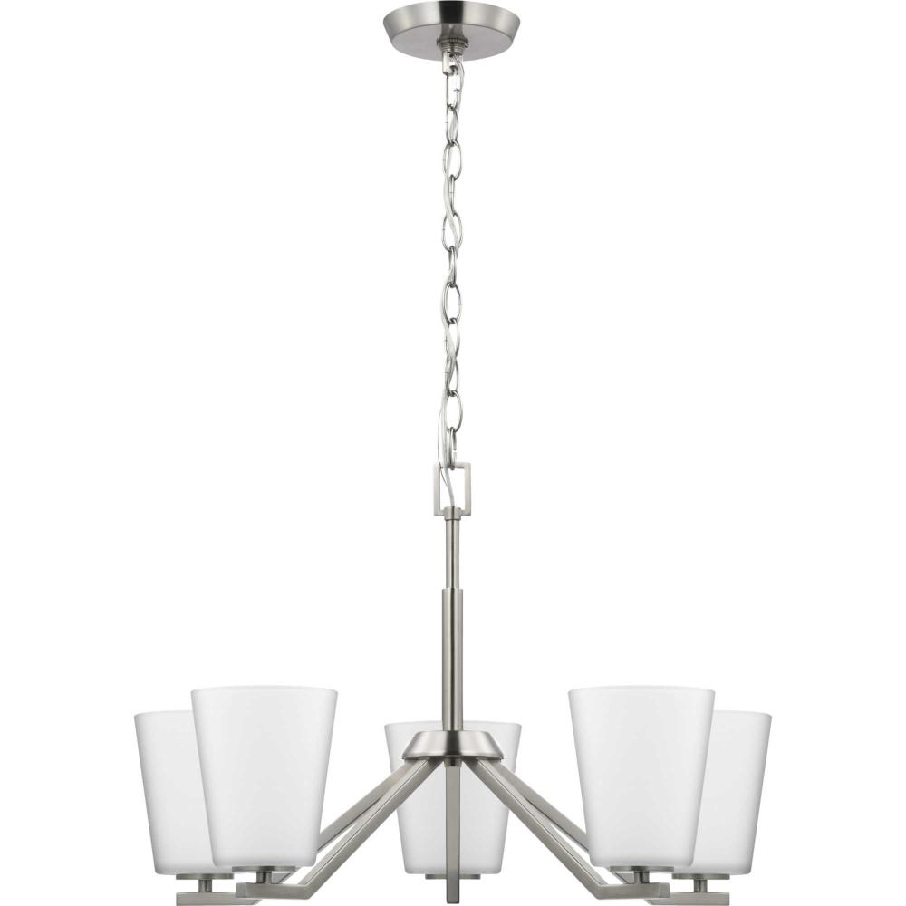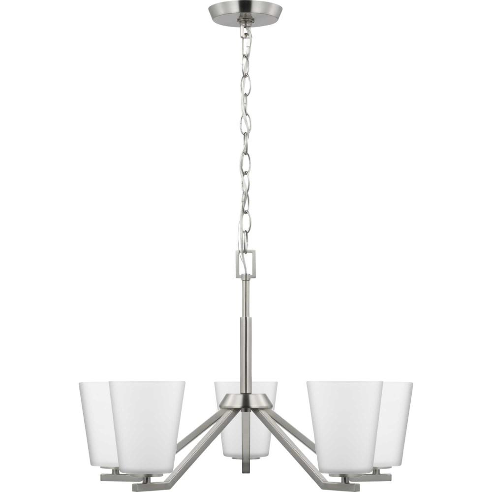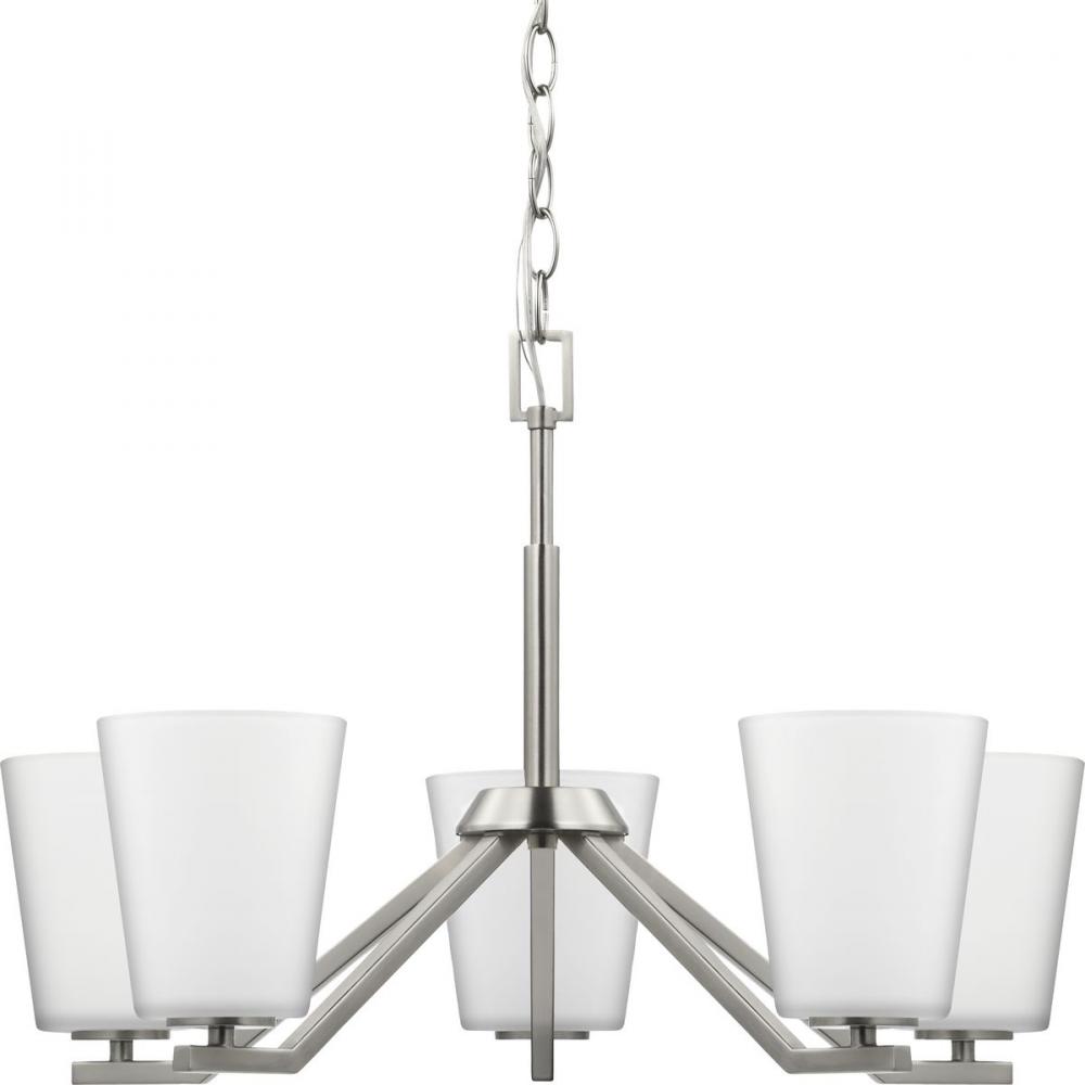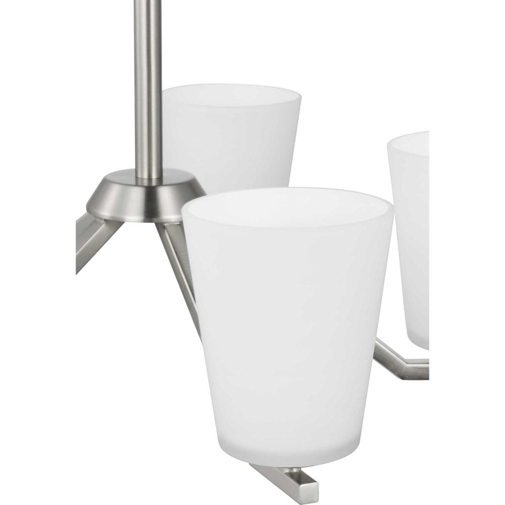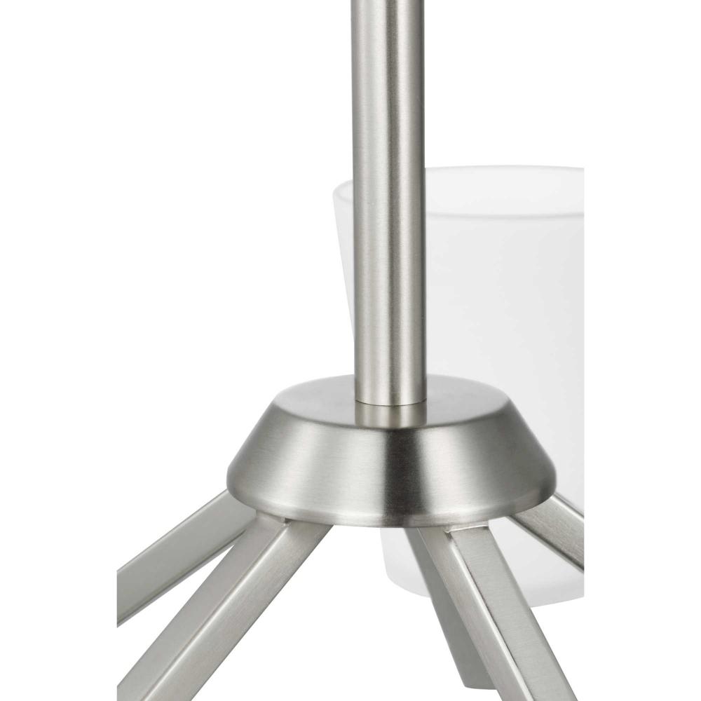 Elegantly extended, the Vertex chandelier is composed of angular forms to create a bold design that perfectly complements dining rooms and living rooms in modern interiors. Its distinctive silhouette is coated in a soft brushed nickel finish. An etched glass shade offers bright illumination to spaces below. Customize the chandelier's hanging height to your ceiling using the Included 48 in. of chain for a variety of ceiling heights and sloped ceilings.